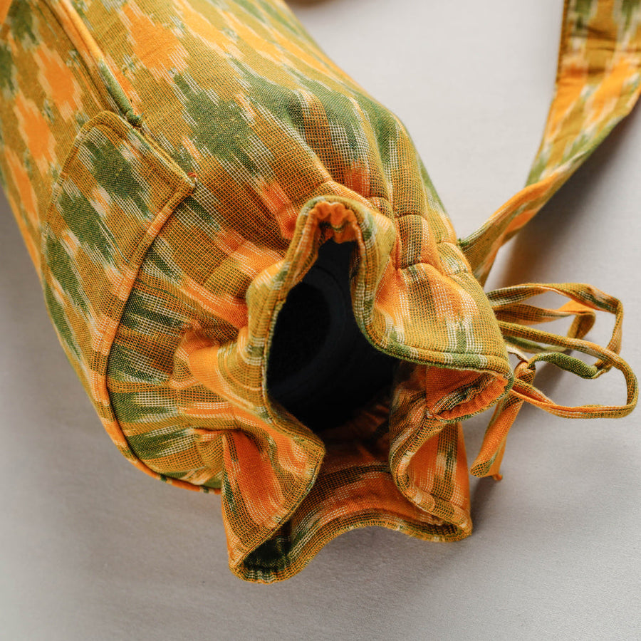 | Material | Yellow pochampally ikat cotton yoga mat bag made of rubber sheet & cotton fabrics with spill-proof plastic layer lining inside. It has one zipper pocket outside, you can easily keep your phone, money & keys. This yoga mat bag features a long strap for carrying ease. Ikat (Ikkat) is a dyeing technique used to pattern textiles that employs a resist dyeing process similar to tie-dye on either the warp or weft fibers prior to dyeing. |