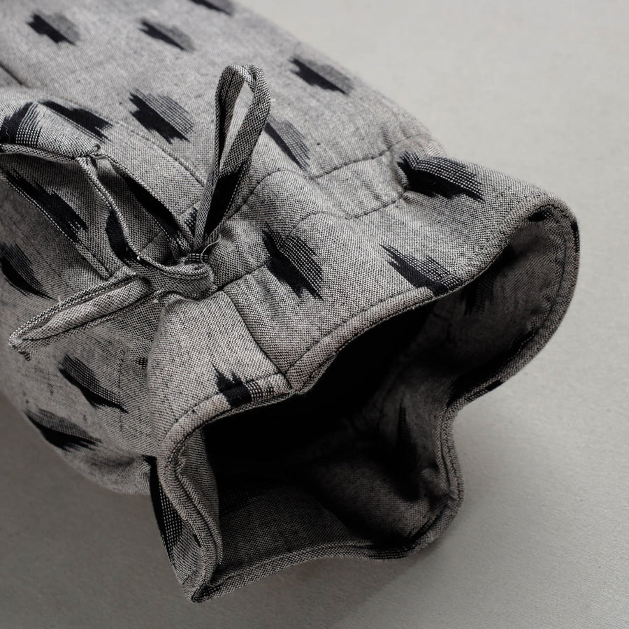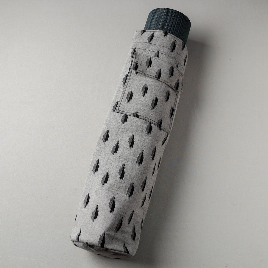 Grey pochampally ikat cotton yoga mat bag made of rubber sheet & cotton fabrics with spill-proof plastic layer lining inside. It has one zipper pocket outside, you can easily keep your phone, money & keys. This yoga mat bag features a long strap for carrying ease. Ikat (Ikkat) is a dyeing technique used to pattern textiles that employs a resist dyeing process similar to tie-dye on either the warp or weft fibers prior to dyeing.