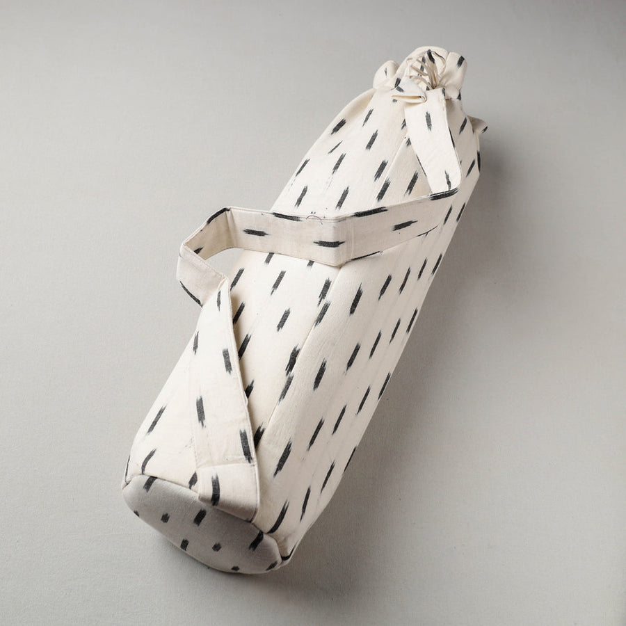 White pochampally ikat cotton yoga mat bag made of rubber sheet & cotton fabrics with spill-proof plastic layer lining inside. It has one zipper pocket outside, you can easily keep your phone, money & keys. This yoga mat bag features a long strap for carrying ease. Ikat (Ikkat) is a dyeing technique used to pattern textiles that employs a resist dyeing process similar to tie-dye on either the warp or weft fibers prior to dyeing.