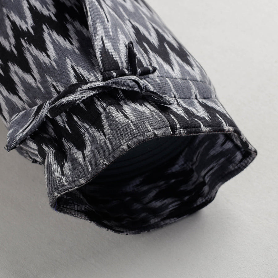 | Material | Grey pochampally ikat cotton yoga mat bag made of rubber sheet & cotton fabrics with spill-proof plastic layer lining inside. It has one zipper pocket outside, you can easily keep your phone, money & keys. This yoga mat bag features a long strap for carrying ease. Ikat (Ikkat) is a dyeing technique used to pattern textiles that employs a resist dyeing process similar to tie-dye on either the warp or weft fibers prior to dyeing. |