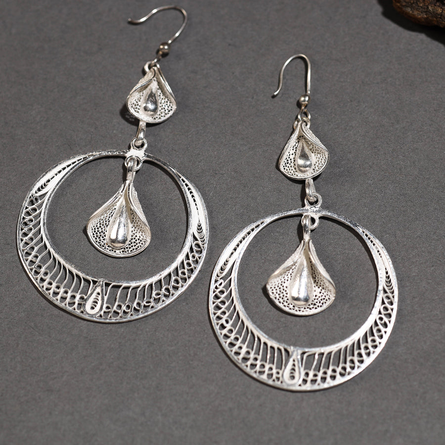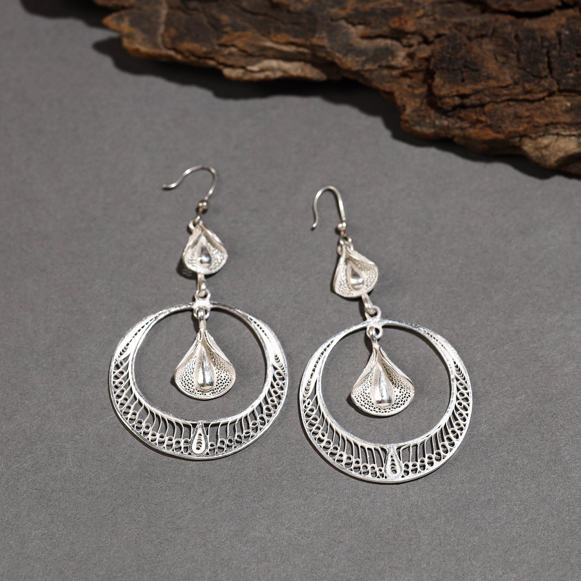 Hand-crafted filigree sterling white silver earrings from Kalinga, Odisha. This product is made by artisans working traditionally with precious ornaments. (made of 92.5% sterling silver) Featuring an eye-catching design and excellent finish, these filigree silver earrings are a must-have in your accessory collection. Filigree is a beautiful form of metalwork. It originated in the ancient world. It is also known as Telkari (from the Anatolian word meaning "wire work"). It is formed using delicate twisted threads of silver, often with repeated curvy motifs, that suggest lace. These fine wire pieces are then soldered together to create a larger piece. This technique became very popular in French fashion jewelry, from 1660 to the present. But its exquisite feminine look is in fashion every year!
