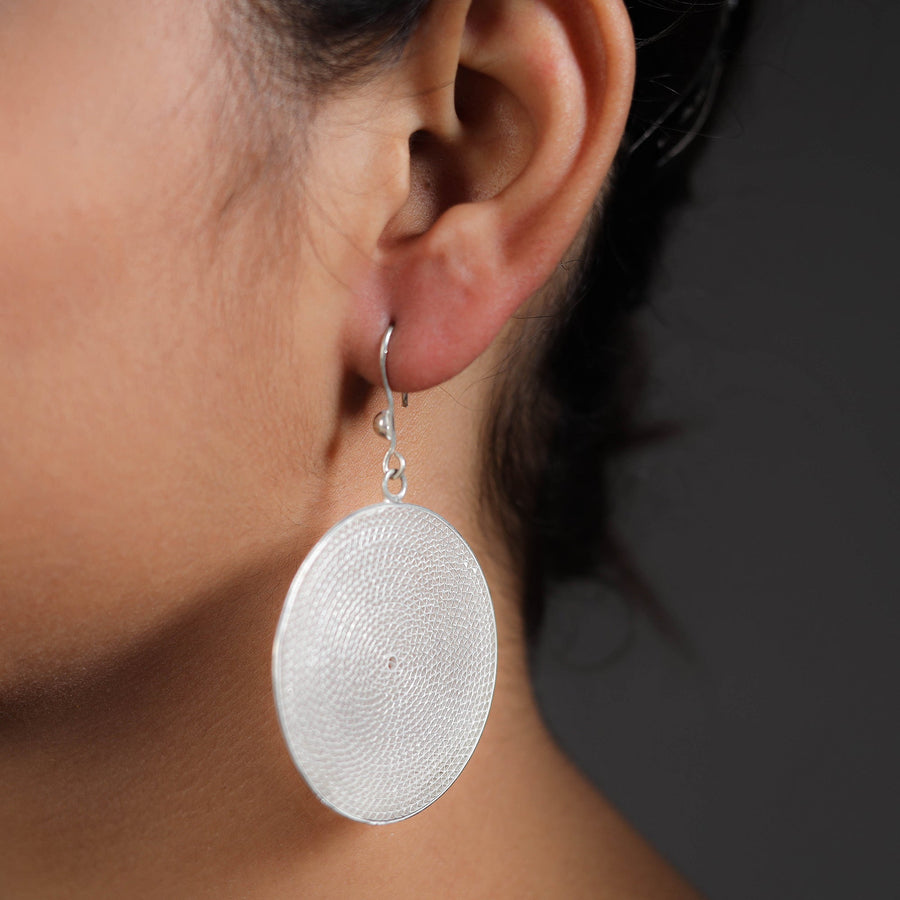 Hand-crafted filigree sterling white silver earrings from Kalinga, Odisha. This product is made by artisans working traditionally with precious ornaments. (made of 92.5% sterling silver) Featuring an eye-catching design and excellent finish, these filigree silver earrings are a must-have in your accessory collection. Filigree is a beautiful form of metalwork. It originated in the ancient world. It is also known as Telkari (from the Anatolian word meaning "wire work"). It is formed using delicate twisted threads of silver, often with repeated curvy motifs, that suggest lace. These fine wire pieces are then soldered together to create a larger piece. This technique became very popular in French fashion jewelry, from 1660 to the present. But its exquisite feminine look is in fashion every year!