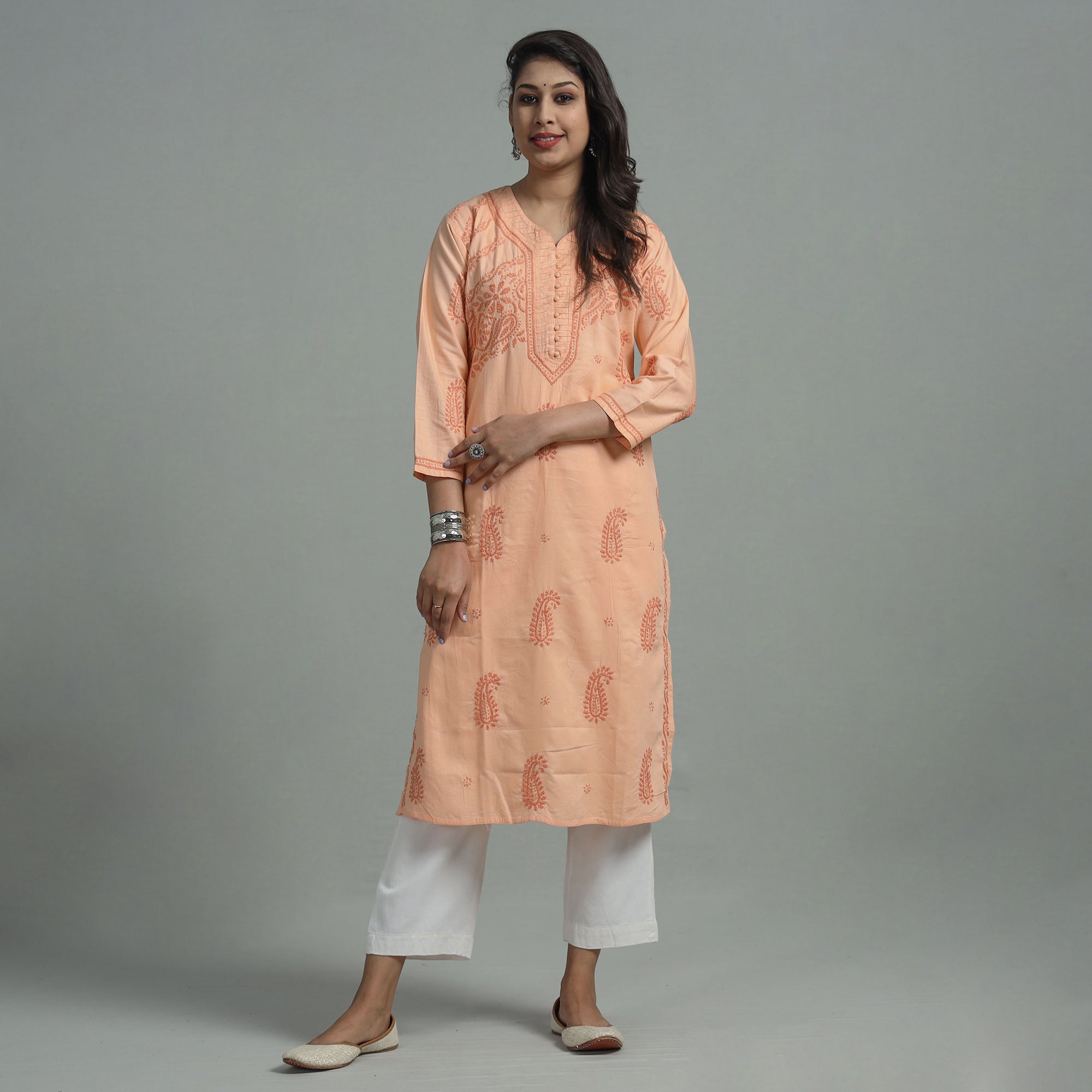 Intricate and artfully done lucknowi chikankari hand embroidered cotton kurta. Chikankari is a traditional textile decorative from Lucknow. It is very delicate and intricate hand embroidery work where thread is embroidered on cool, pastel shades of light cotton garments