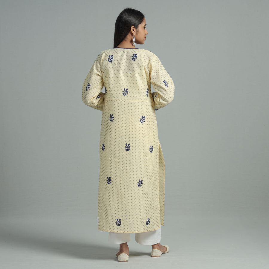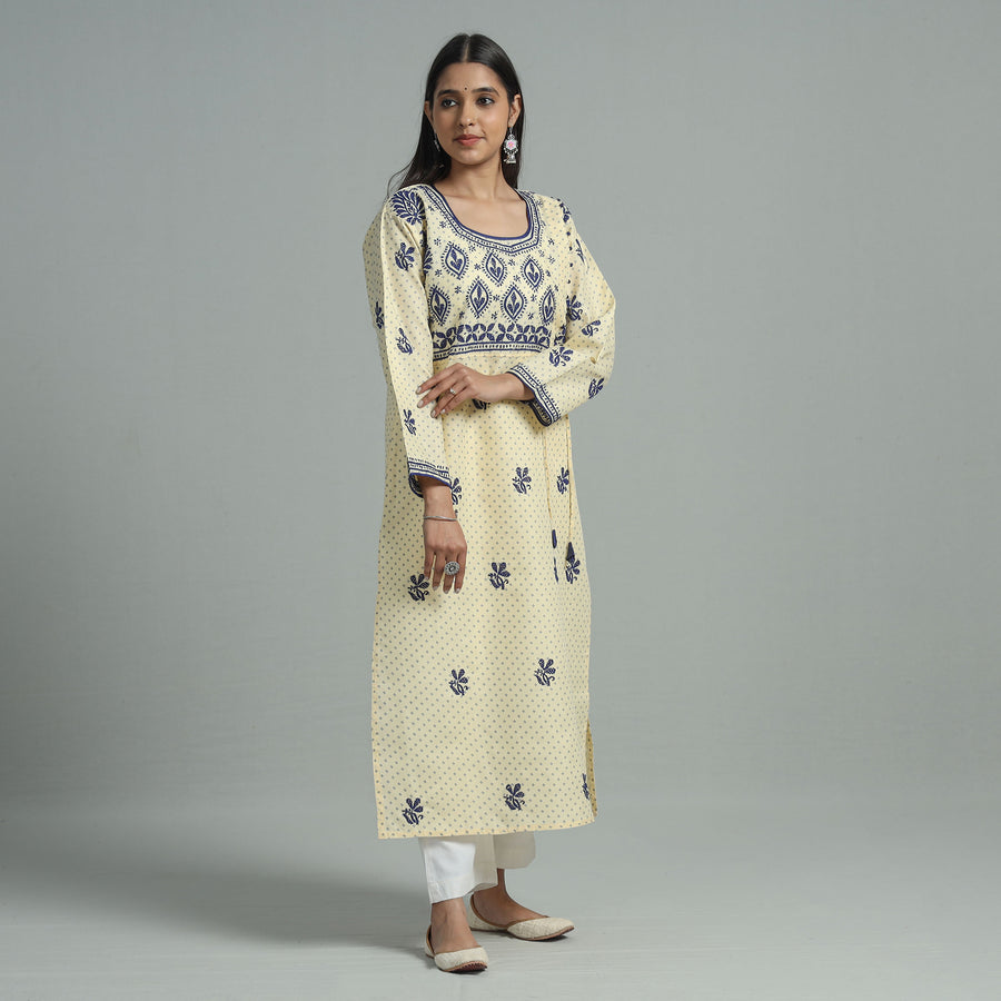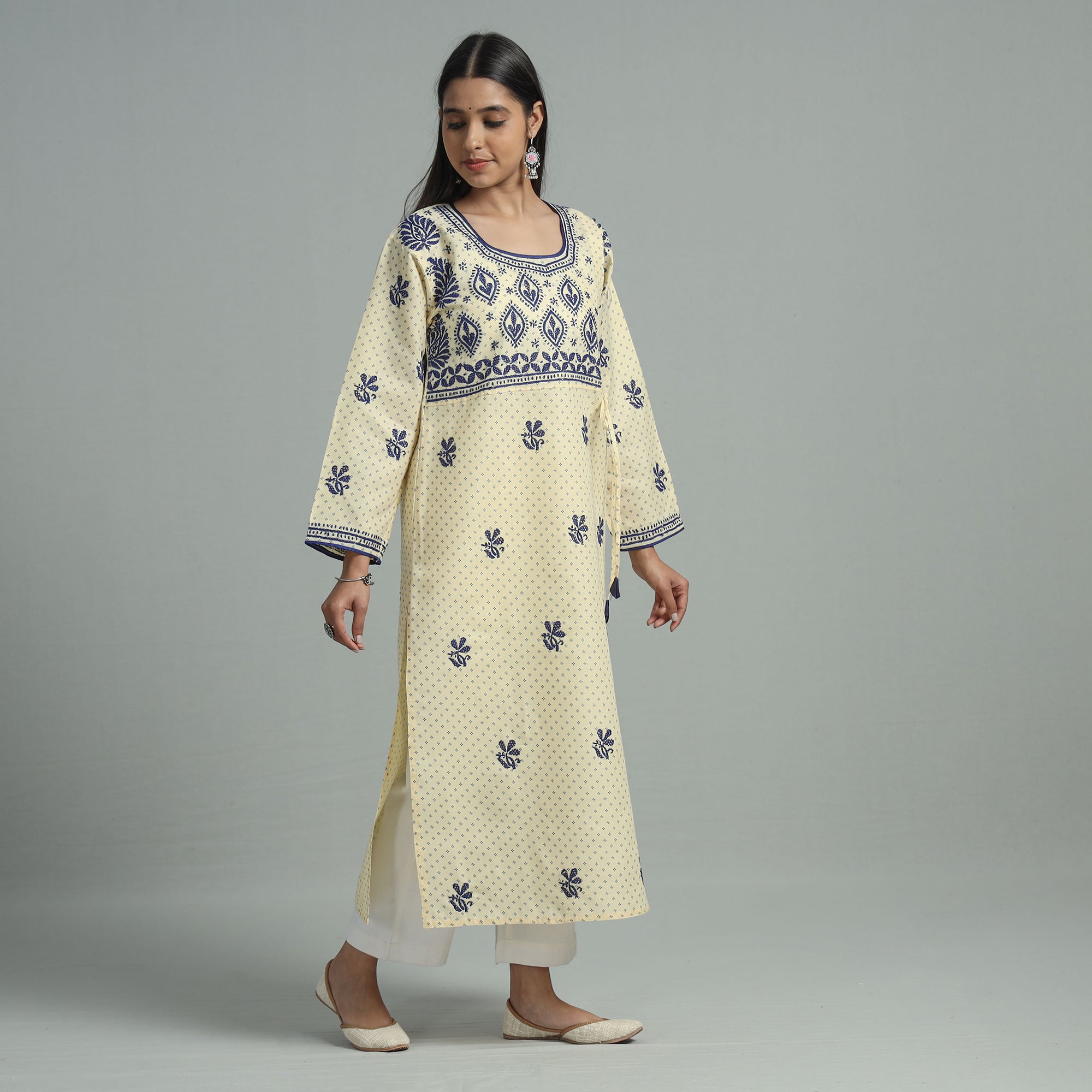 Intricate and artfully done lucknowi chikankari hand embroidered cotton kurta. Chikankari is a traditional textile decorative from Lucknow. It is very delicate and intricate hand embroidery work where thread is embroidered on cool, pastel shades of light cotton garments