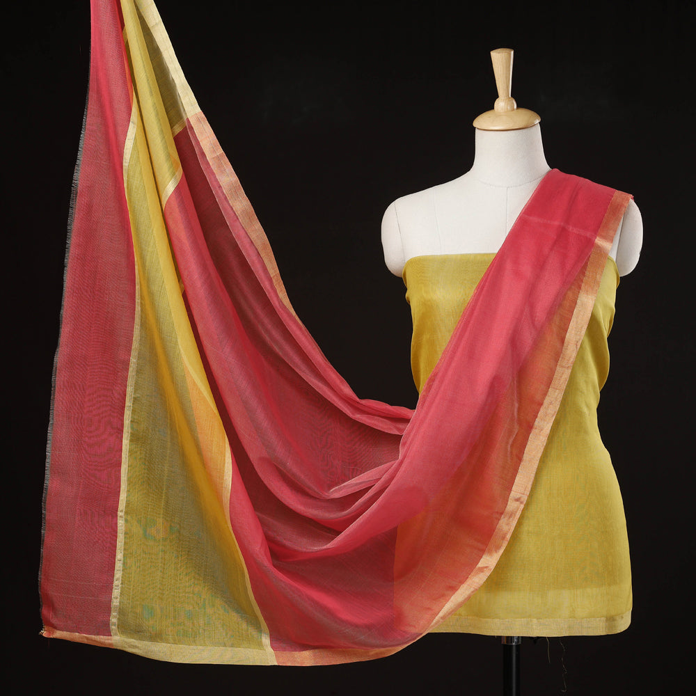 Fine quality chanderi silk-cotton handloom 2pc suit material set with zari border. Chanderi silks are known for its gossamer looks and amazing feel. Chanderi weaving is practiced in the historic town of Chanderi in Madhya Pradesh.