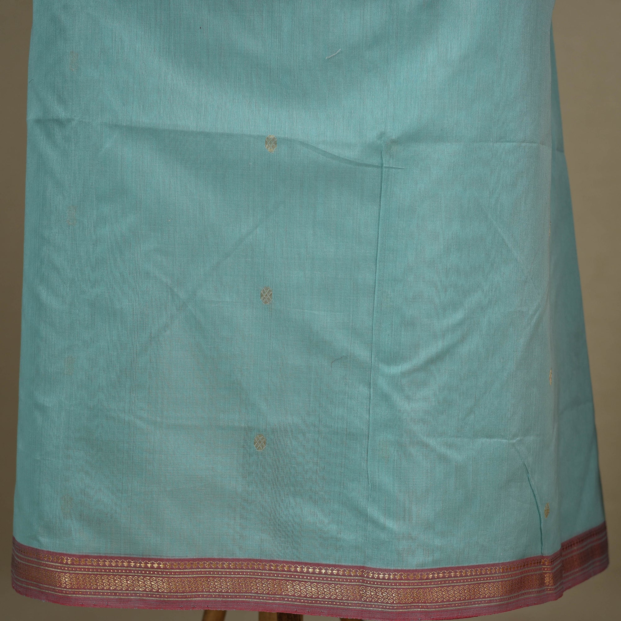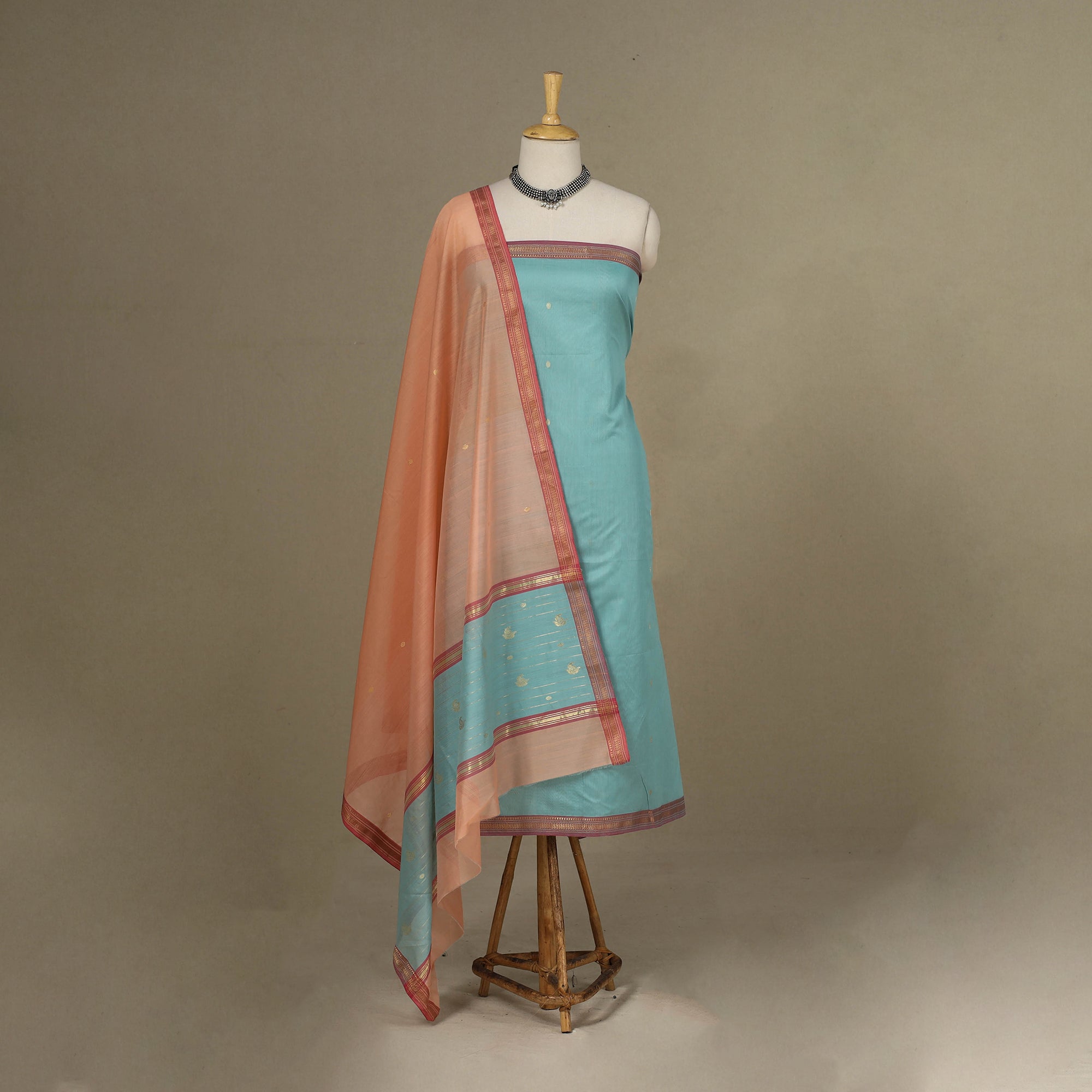 Fine quality blue chanderi silk-cotton handloom zari buti kurta material & dupatta with nakshi zari border and plain chanderi silk-cotton bottom material.