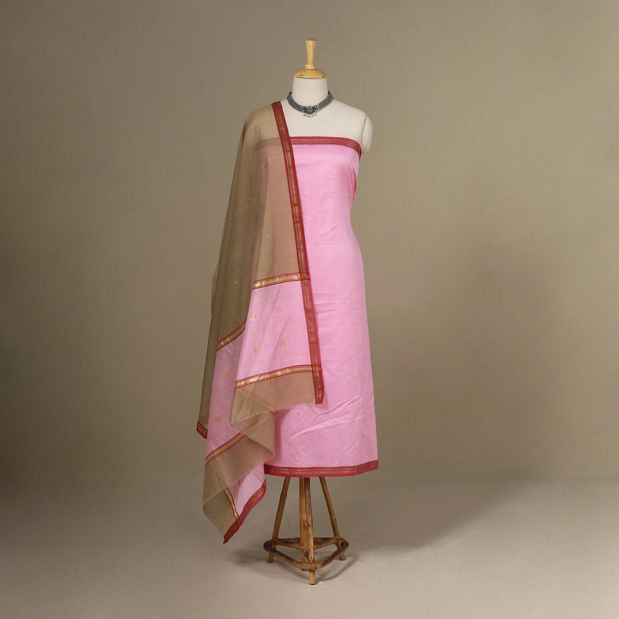 Fine quality pink chanderi silk-cotton handloom zari buti kurta material & dupatta with nakshi zari border and plain chanderi silk-cotton bottom material.