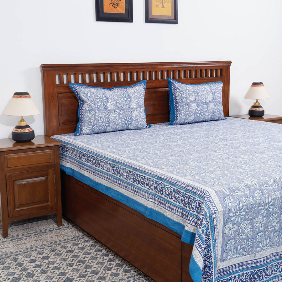 Fine quality sanganeri block printing cotton double bed sheet with pillow covers. Sanganeri is a hand-block printing technique originating from Sanganer, a village in the southern part of Jaipur, Rajasthan. Bleed free VAT dyed used.