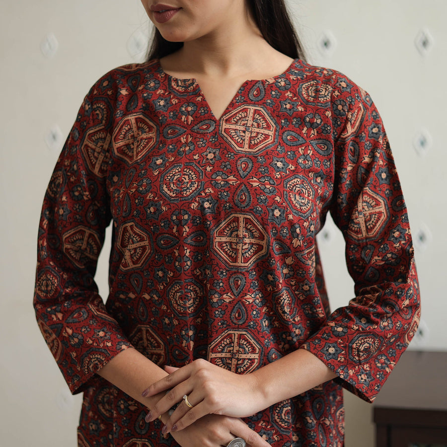 | Material | Step into sustainable style with our red block printed cotton ajrakh co-ord set, meticulously handcrafted using traditional block printing techniques from Kutch. Made from soft, natural-dyed cotton, this two-piece outfit features an elasticated pant and a chic top, ensuring both comfort and elegance. Ajrakh artistry reflects centuries-old craftsmanship, adding timeless charm to your wardrobe. |