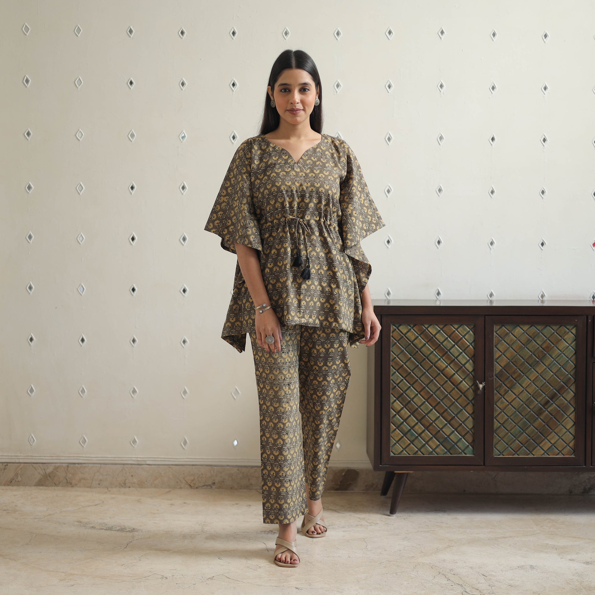 | Material | Embrace sustainable style with this brown block printed cotton kaftan ajrakh co-ord set, featuring traditional block printing from Kutch. Made with natural-dyed cotton, the set includes an elasticated pant and a stylish kaftan for all-day comfort. Perfect for casual outings or special occasions, it combines timeless craftsmanship with modern elegance. |