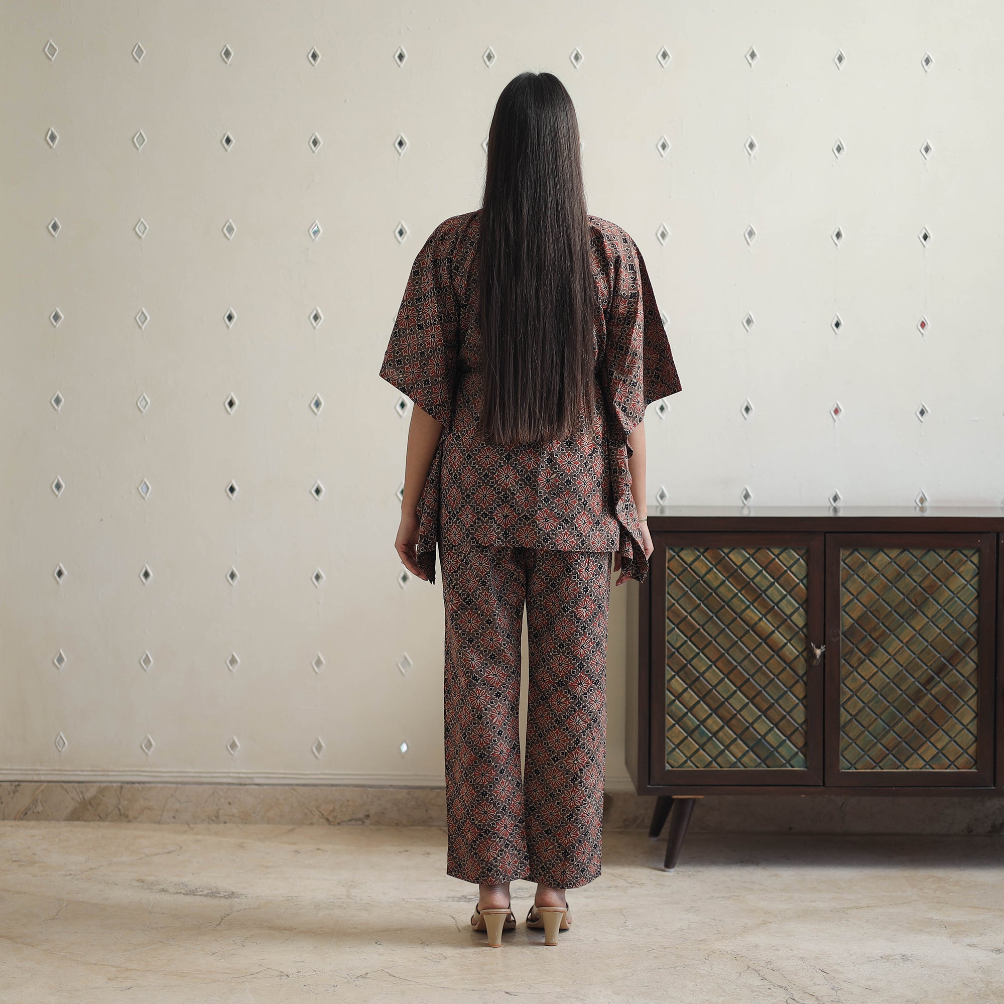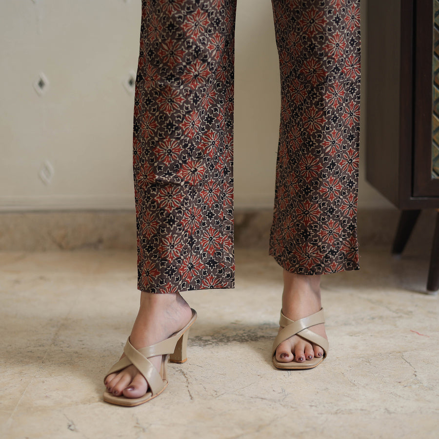 | Material | Embrace sustainable style with this brown block printed cotton kaftan ajrakh co-ord set, featuring traditional block printing from Kutch. Made with natural-dyed cotton, the set includes an elasticated pant and a stylish kaftan for all-day comfort. Perfect for casual outings or special occasions, it combines timeless craftsmanship with modern elegance. |