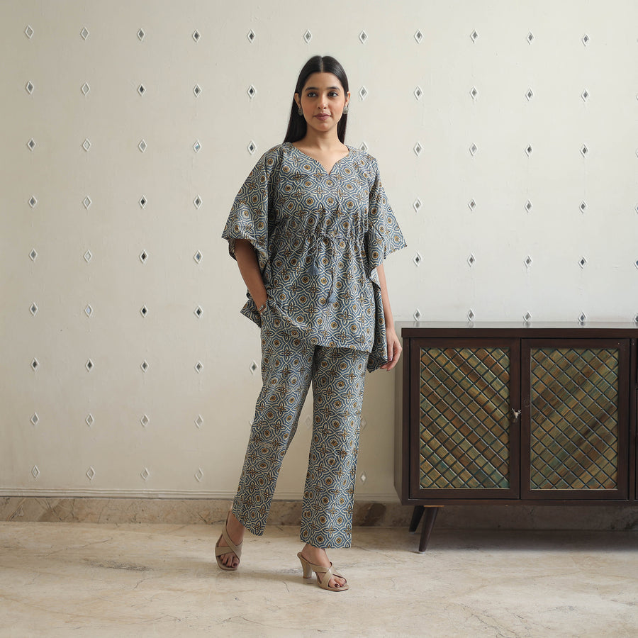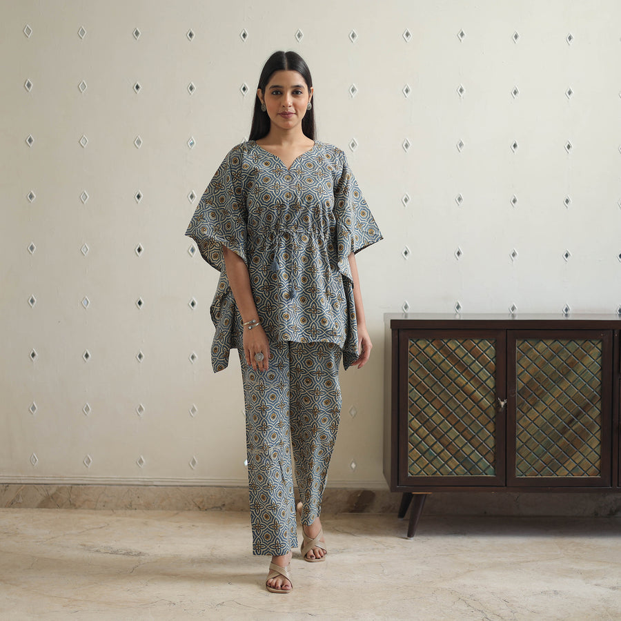 | Material | Embrace sustainable style with this grey block printed cotton kaftan ajrakh co-ord set, featuring traditional block printing from Kutch. Made with natural-dyed cotton, the set includes an elasticated pant and a stylish kaftan for all-day comfort. Perfect for casual outings or special occasions, it combines timeless craftsmanship with modern elegance. |