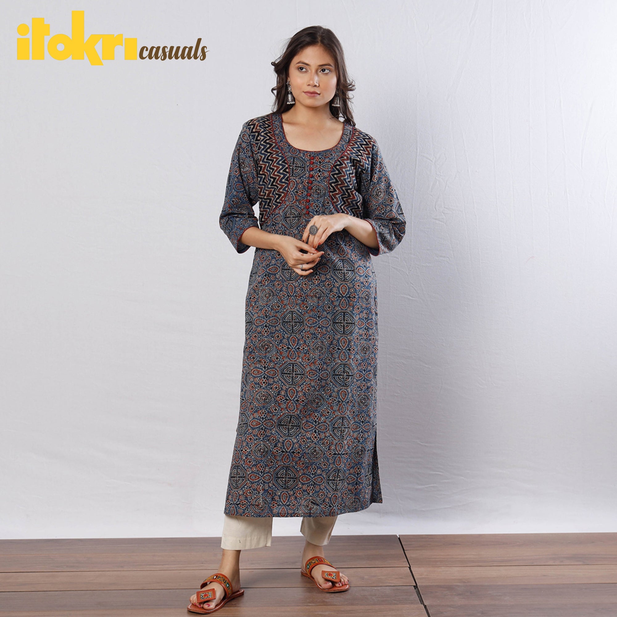 Authentic ajrakh block printed pure cotton 3/4 sleeves kurta with side pocket. The fabric has been made using natural dyes through traditional process of hand block printing practiced by the artisans in Kutch region of Gujarat. Ajrakh is a traditional vegetable dyeing and resist block-printing technique on cloth. It is estimated to be around 4,500 years old. The Ajrakh artisans in India are originally from Sindh and they migrated to Kutch in Gujarat and Barmer in Rajasthan. Ajrakh is the traditional attire of the Maldhari pastoral community of Bhuj. The process of 'Ajrakh' is a long drawn process with many stages and each layer of colour is printed after a gap of time so the cloth has to stay for the day.