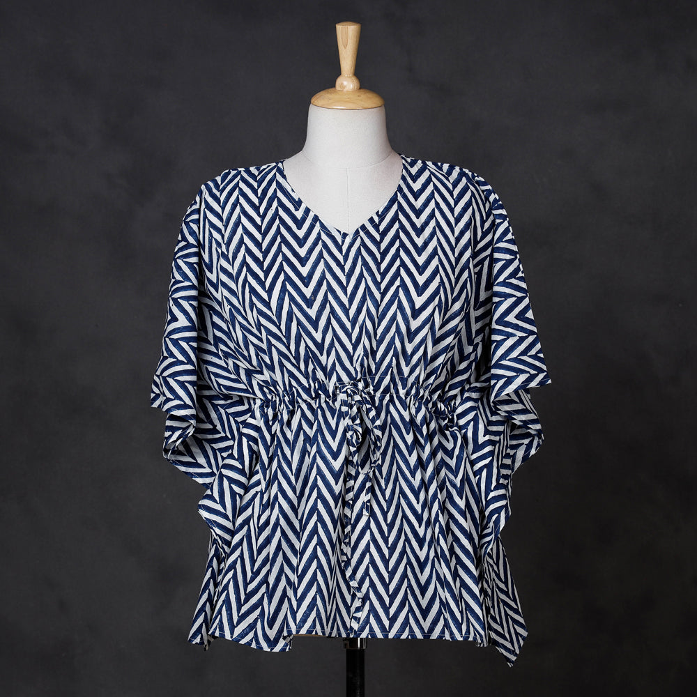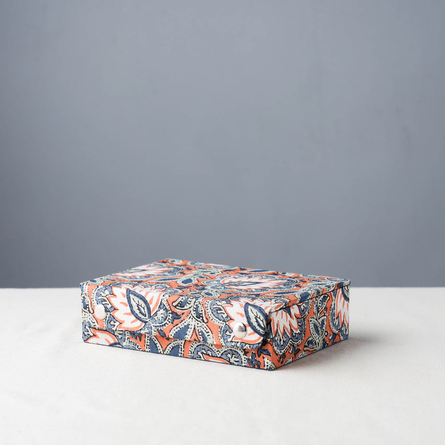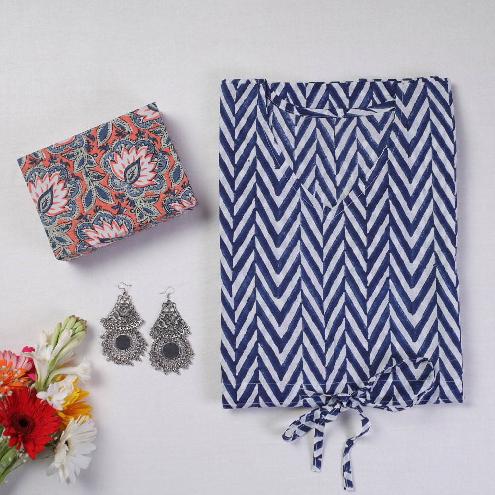 This Hamper include : 1 Hand Printed Cotton Kaftan with Tie-Up Waist (Short), 1 Brass Base Oxidized Earrings, 1 Sukriti Handmade Printed Fabric Jewelry Box (Small).