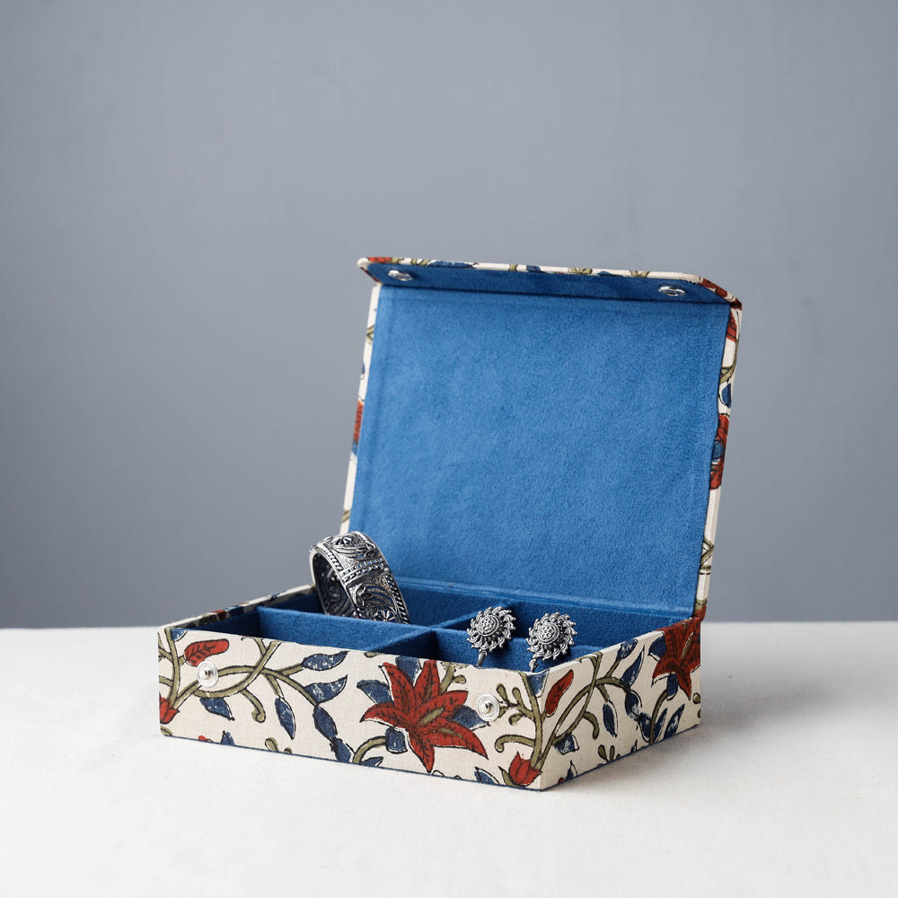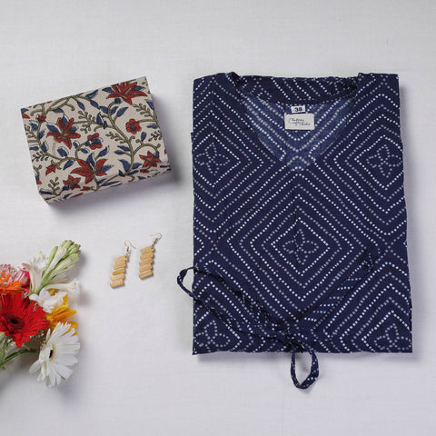 This Hamper include : 1 Hand Printed Cotton Kaftan with Tie-Up Waist (Short), 1 Handcrafted Bamboo Five Striped Earrings, 1 Sukriti Handmade Printed Fabric Jewelry Box (Small).