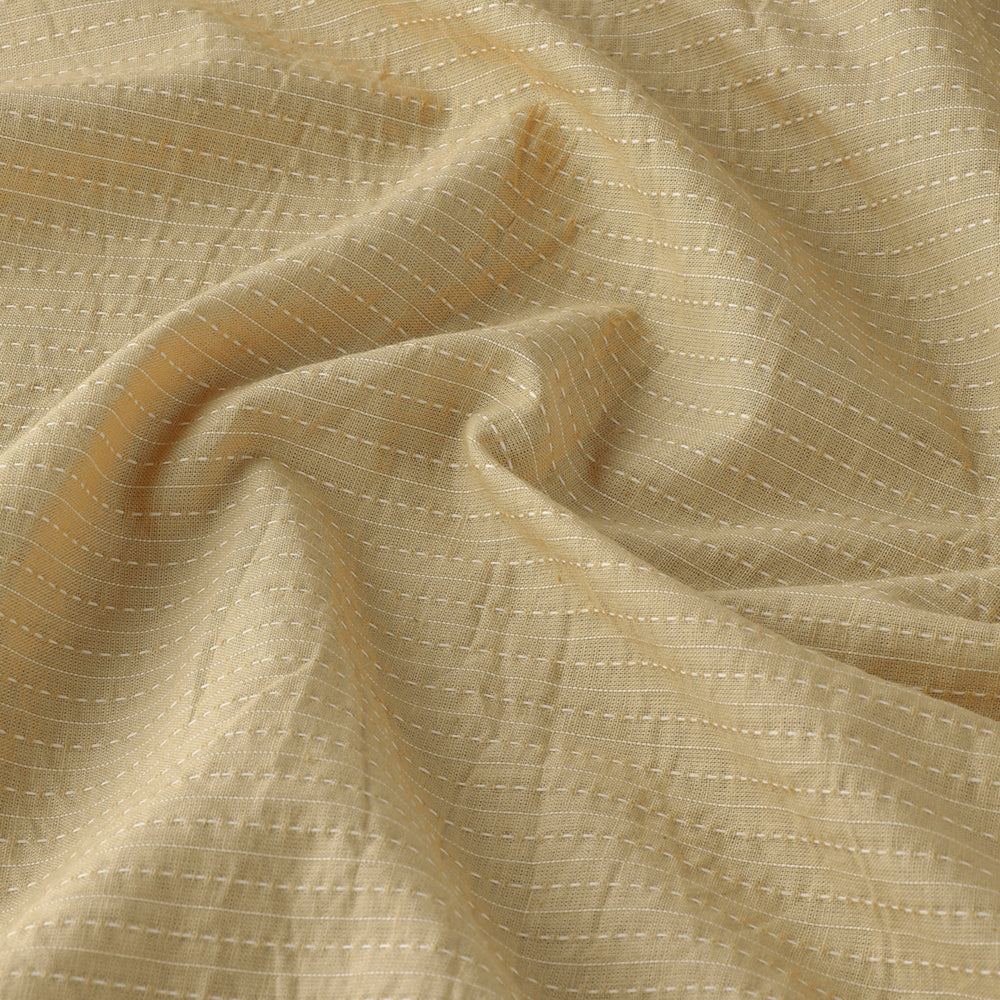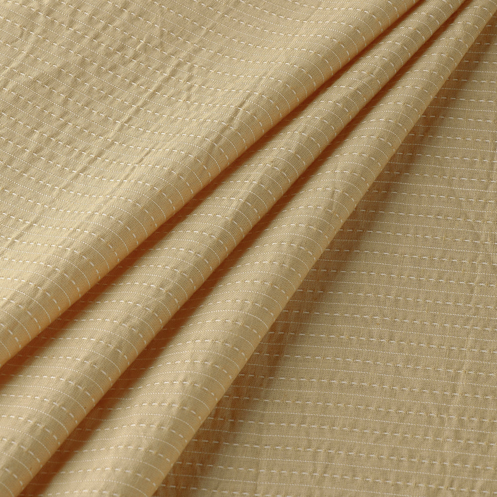 This beige prewashed running stitch cotton fabric is of fine quality and has been dyed a plain color. It was machine made and not created through handmade processes. The fabric originates from Jaipur, Rajasthan, and is ideal for a variety of projects due to its softness and durability.