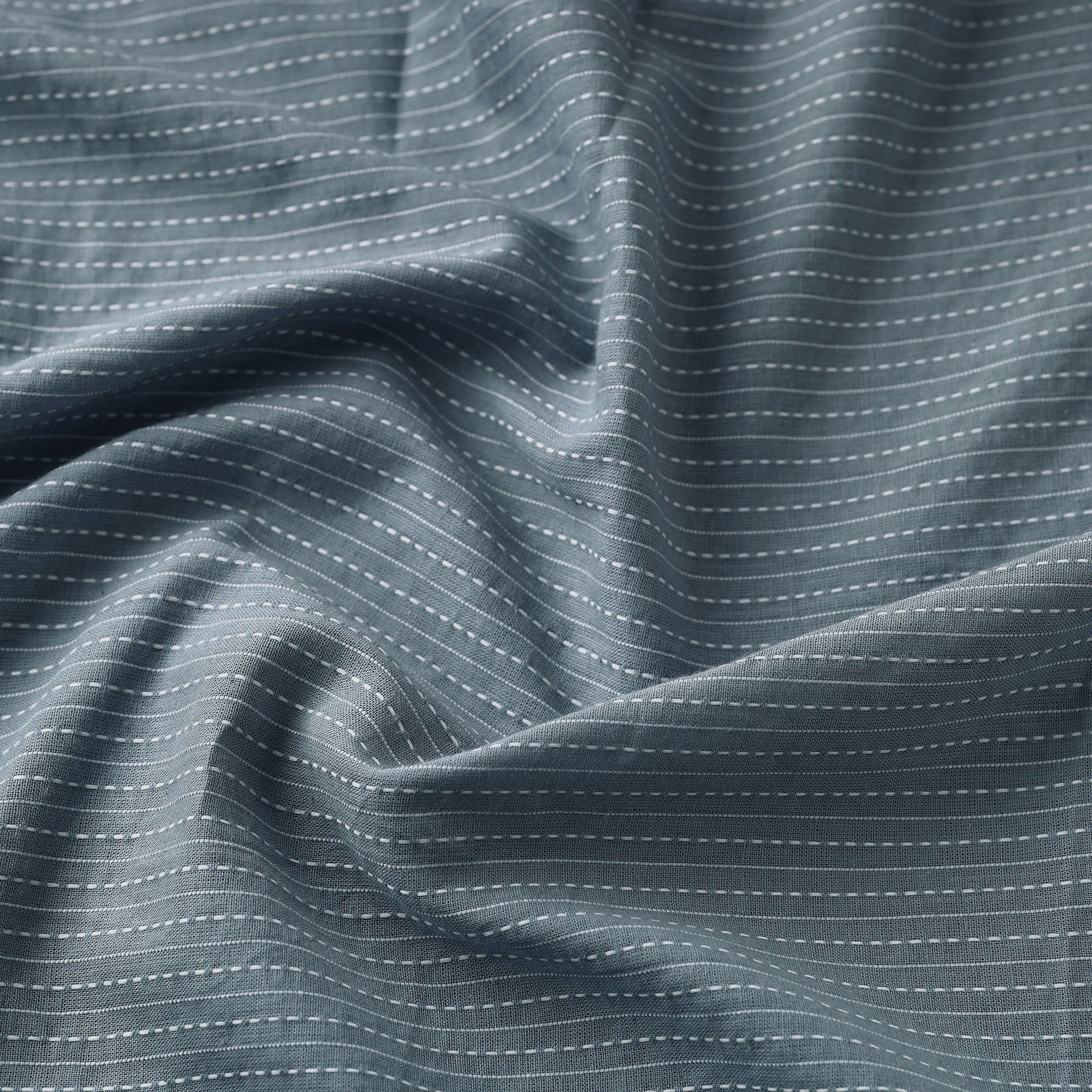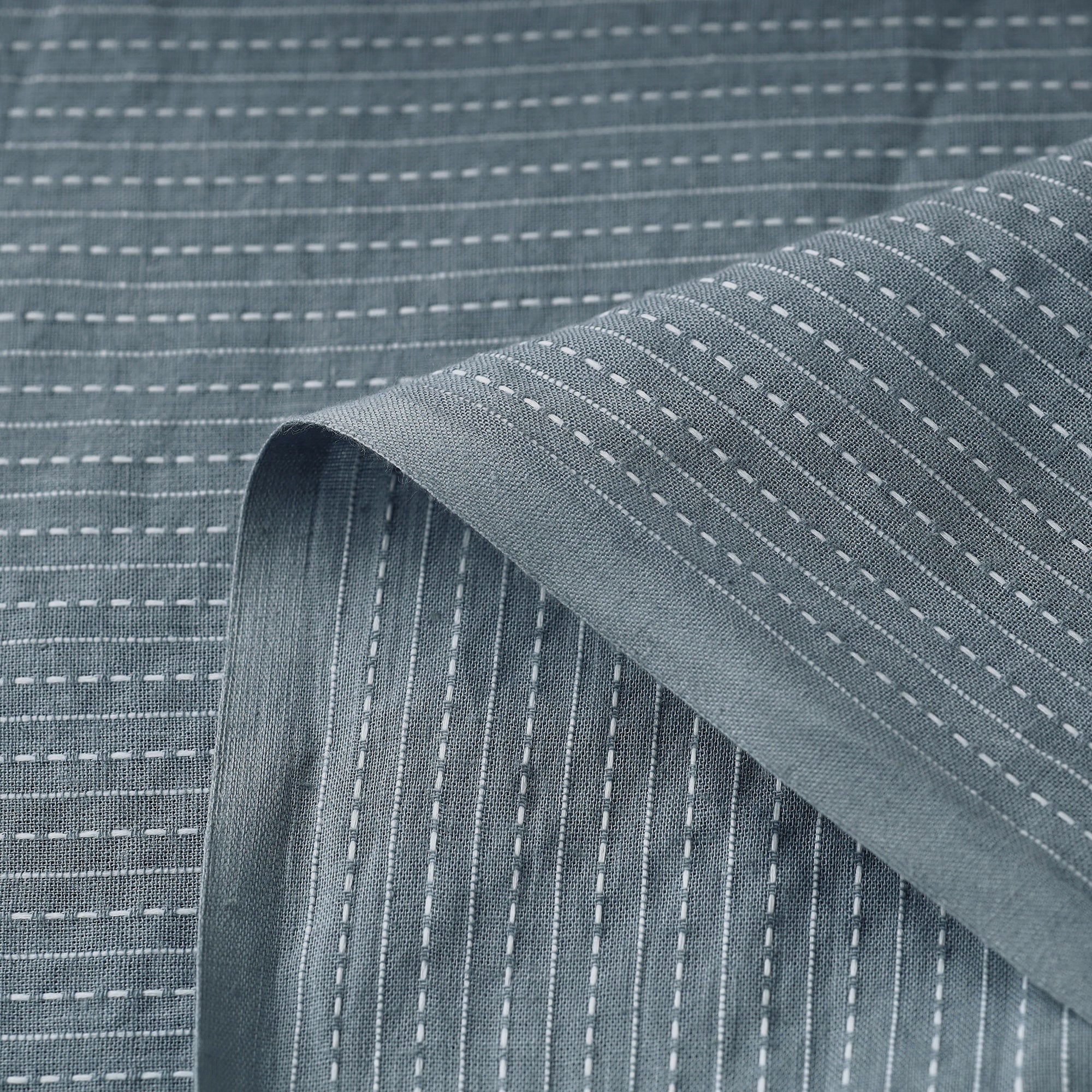 This grey prewashed running stitch cotton fabric is of fine quality and has been dyed a plain color. It was machine made and not created through handmade processes. The fabric originates from Jaipur, Rajasthan, and is ideal for a variety of projects due to its softness and durability.