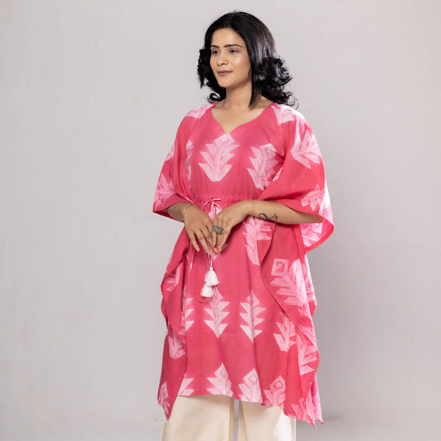 Fine quality shibori tie-dye cotton knee length kaftan. A traditional kaftan or caftan is an knee-length garment with long, flowing sleeves. It has an adjustable drawstring waist. These loose-fitting cotton kaftans are enhanced by a soft touch and beautiful tie-dye patterns. This dress will allow you to move with ease and comfort. The drawstring waist tie will give you the freedom to customize the fit to suit your unique shape.