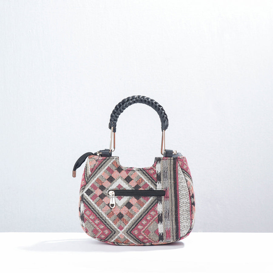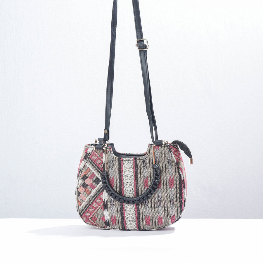 Grey handcrafted hand bag with detachable & adjustable sling, made from woven cotton fabric & rexine from marudhara, Barmer. It has one zipper pocket outside & one zipper pocket inside. Ample space to keep most of your essentials.
