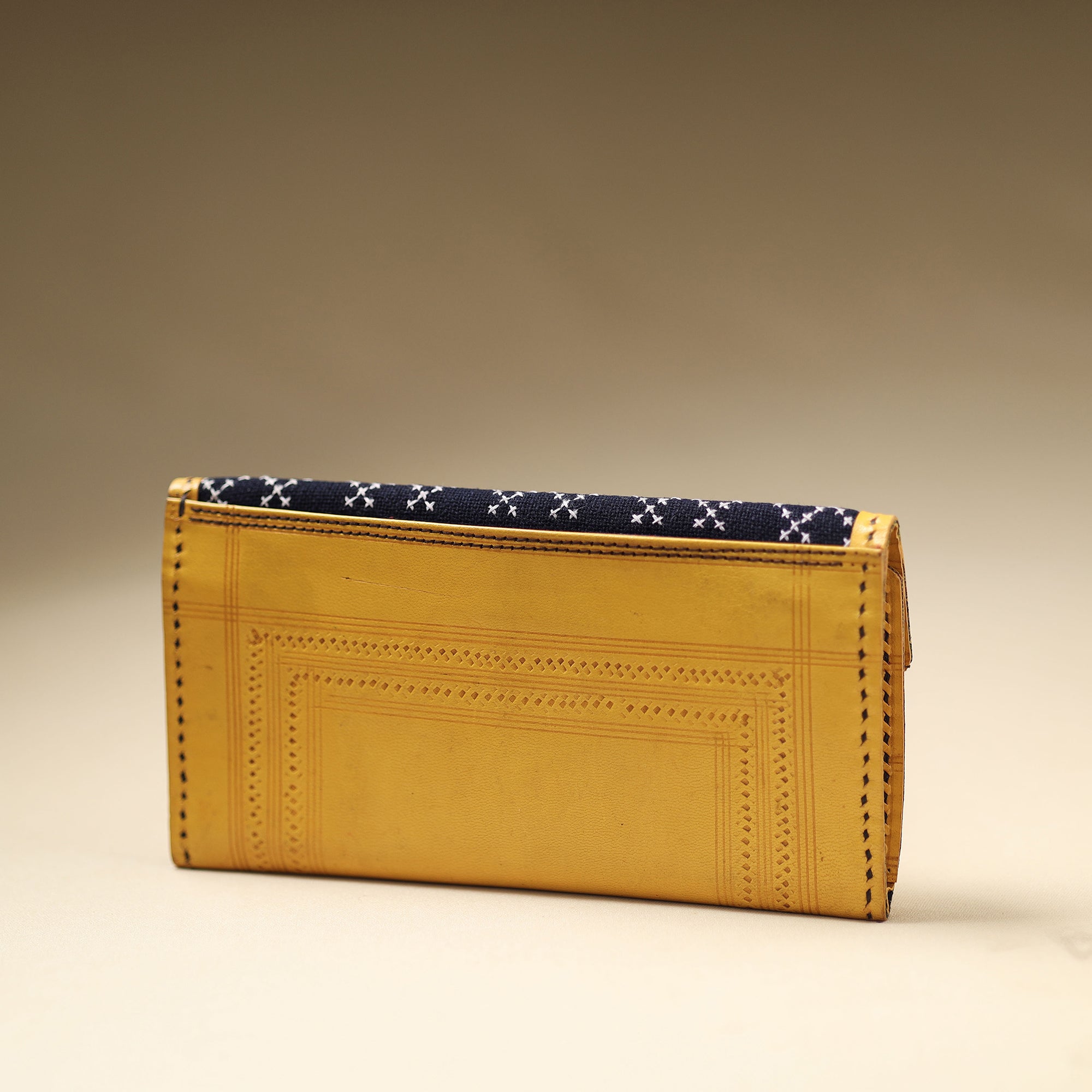 Handcrafted yellow wallet made from cotton fabric & cruelty free leather with intricate kutch work jat embroidery. It has one simple pocket outside & two simple, one zipper pocket & five card slots inside with cotton fabric lining inside. Ample space to keep most of your essentials.
