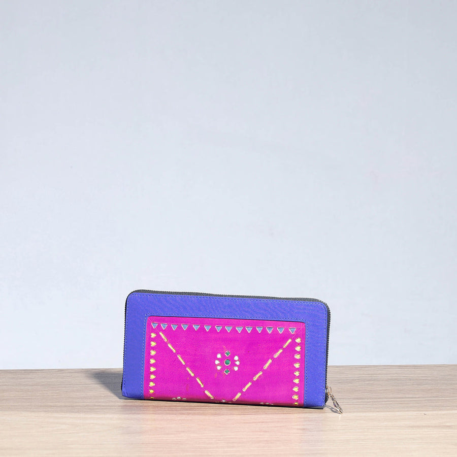 Handcrafted purple wallet made from cruelty free leather. It has two sections, four card slots, two simple & one zipper pocket inside. Ample space to keep most of your essentials.