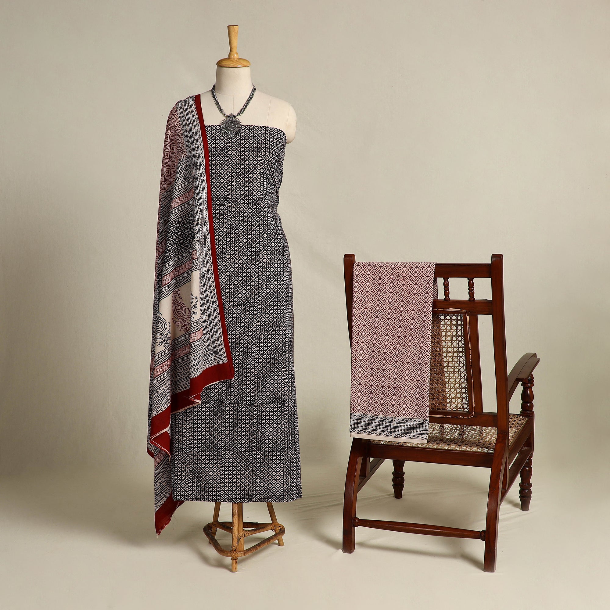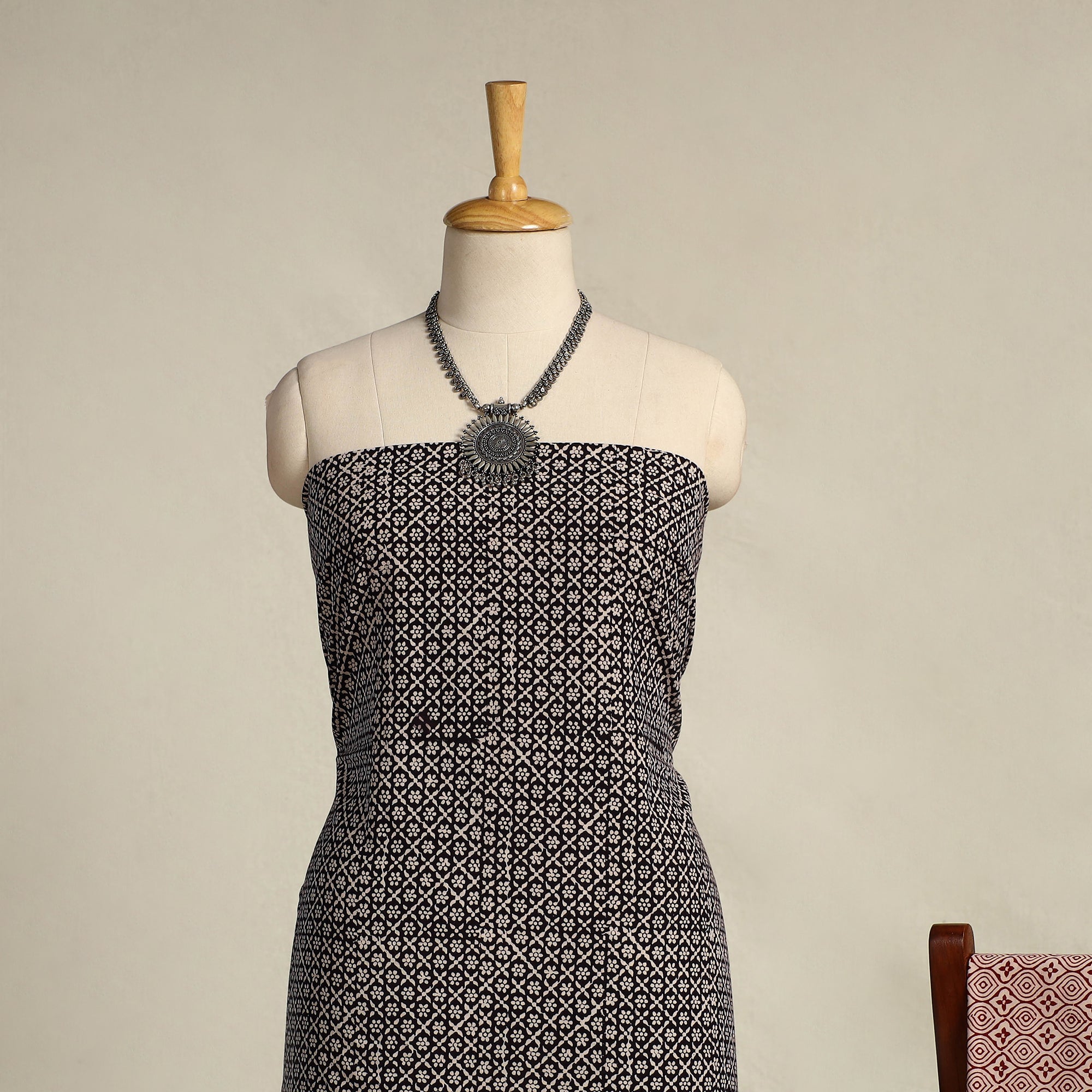 Fine quality black bagh block printed cotton 3pc suit material set, made using natural dyes through traditional process of hand block printing by Bilal Khatri practiced in Bagh, the Dhar district of Madhya Pradesh.