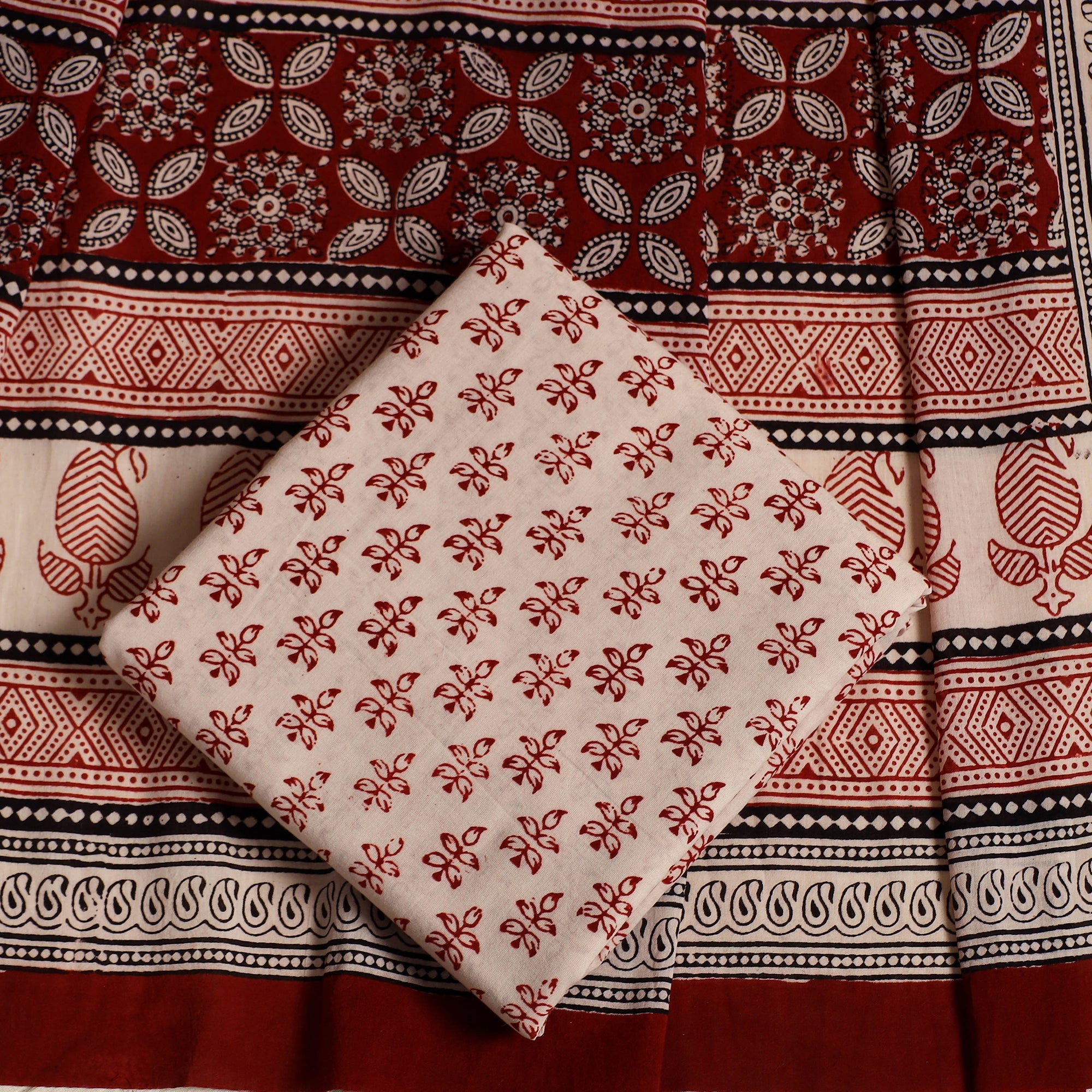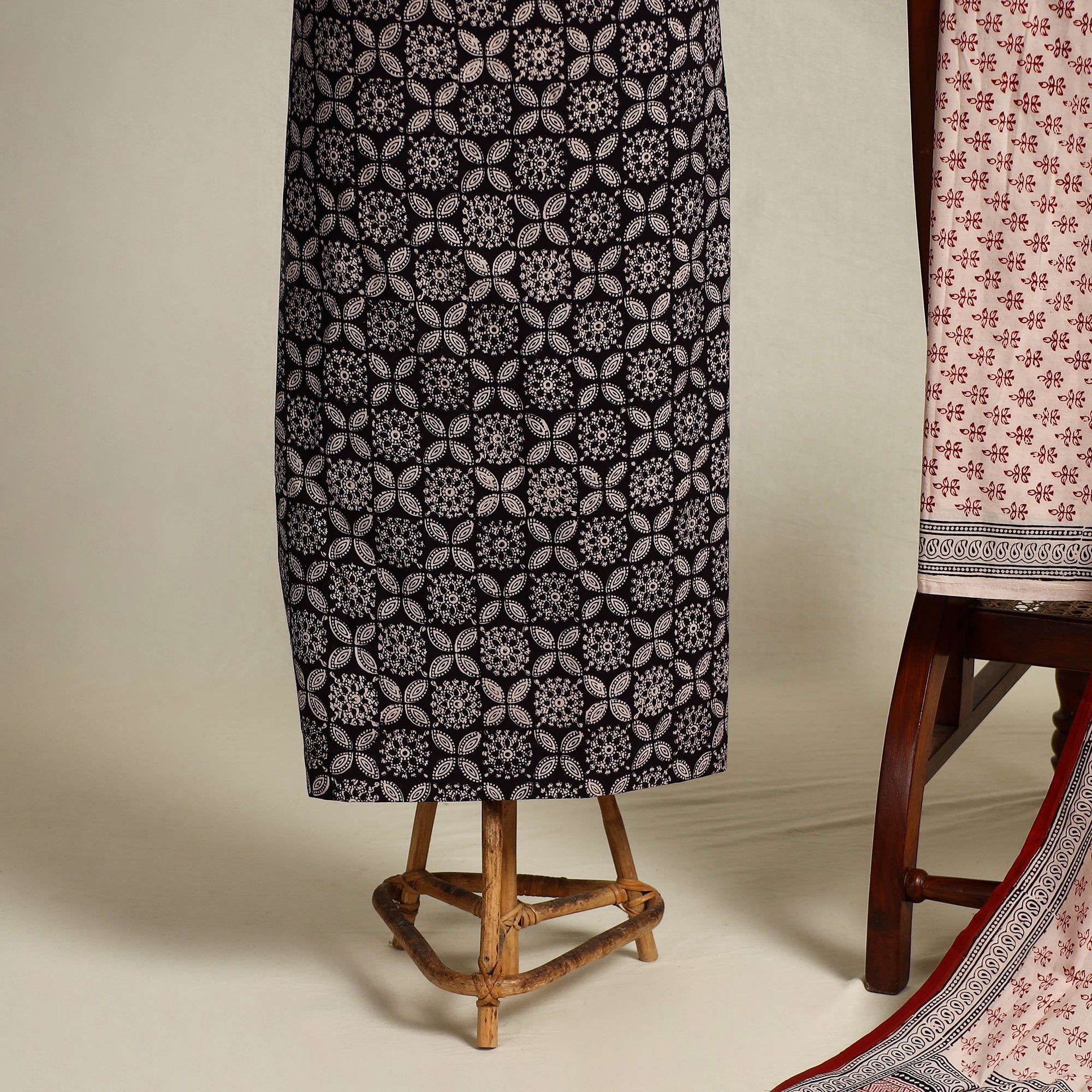 Fine quality black bagh block printing cotton 3pc suit material set, made using natural dyes through traditional process of hand block printing by Bilal Khatri practiced in Bagh, the Dhar district of Madhya Pradesh.