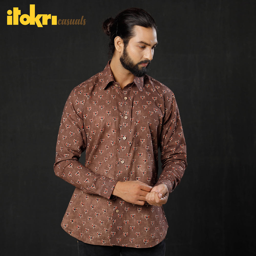 Fine quality ajrakh hand block printed cotton men full sleeve shirt, made using natural dyes through traditional ajrakh technique of hand block printing practised in Kutch region of Gujarat.