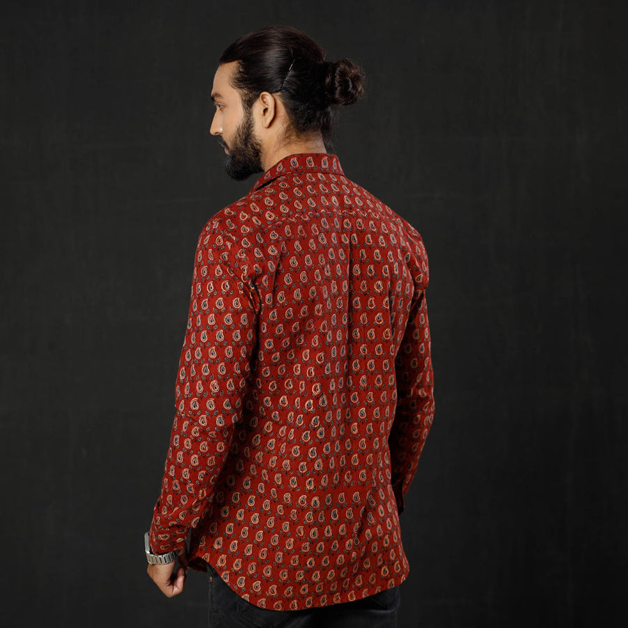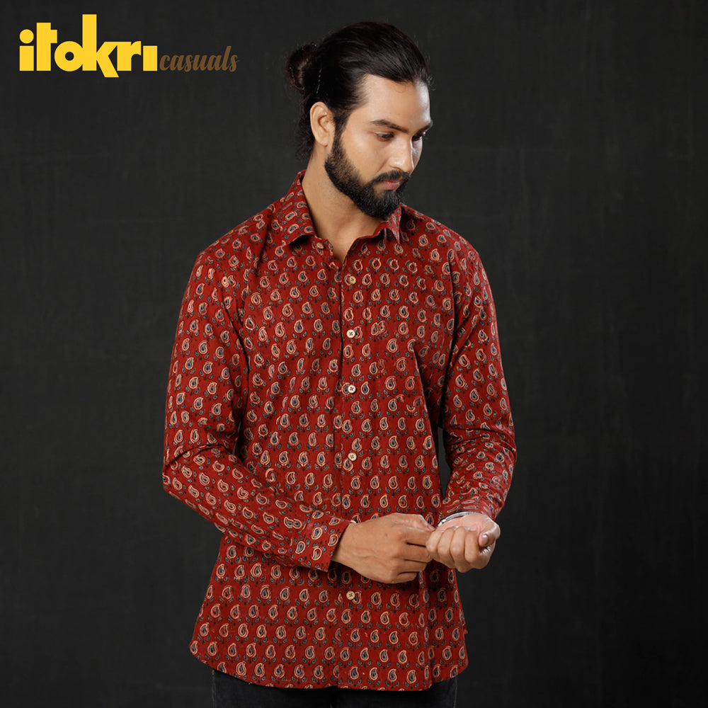 Fine quality ajrakh hand block printed cotton men full sleeve shirt, made using natural dyes through traditional ajrakh technique of hand block printing practised in Kutch region of Gujarat.