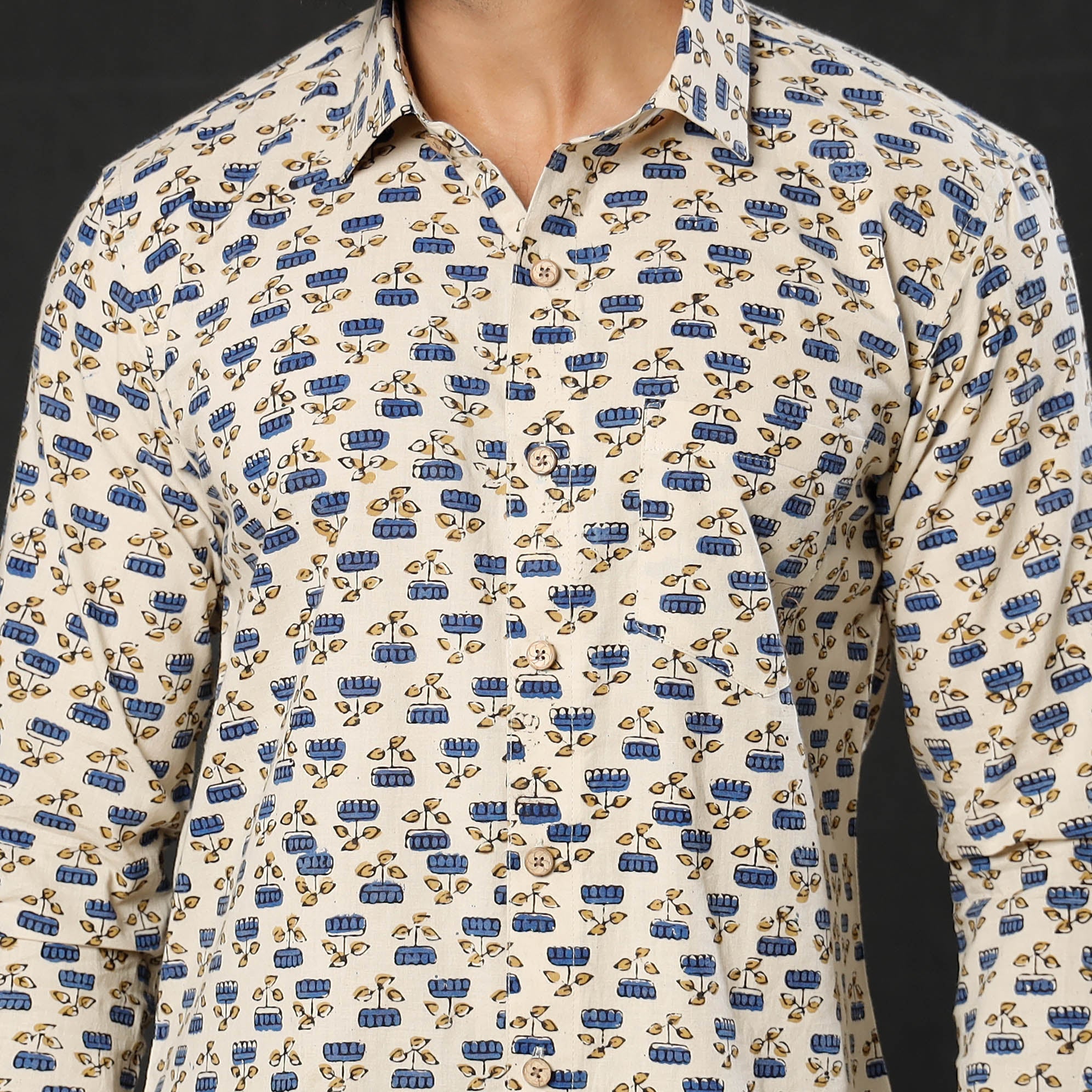 Fine quality ajrakh hand block printed cotton men full sleeve shirt, made using natural dyes through traditional ajrakh technique of hand block printing practised in Kutch region of Gujarat.