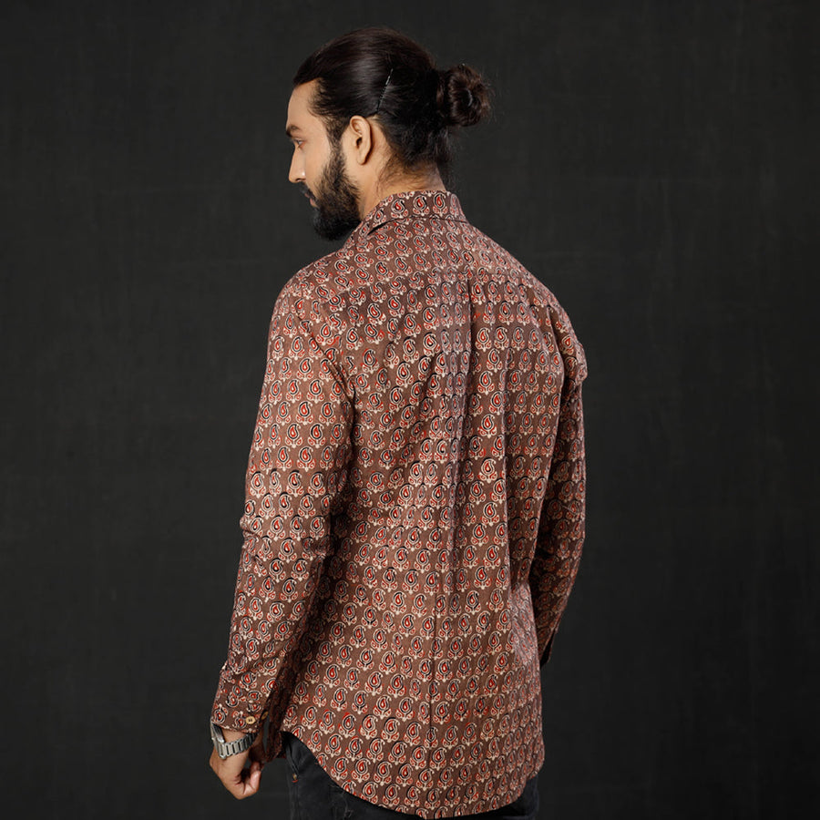 Fine quality ajrakh hand block printed cotton men full sleeve shirt, made using natural dyes through traditional ajrakh technique of hand block printing practised in Kutch region of Gujarat.