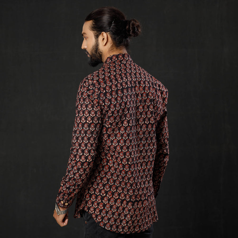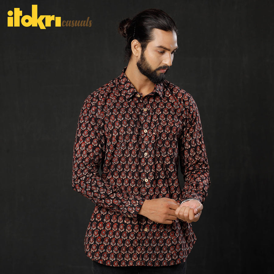Fine quality ajrakh hand block printed cotton men full sleeve shirt, made using natural dyes through traditional ajrakh technique of hand block printing practised in Kutch region of Gujarat.