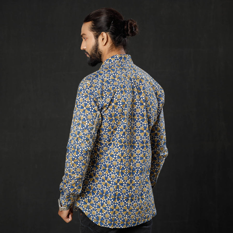 Fine quality ajrakh hand block printed cotton men full sleeve shirt, made using natural dyes through traditional ajrakh technique of hand block printing practised in Kutch region of Gujarat.