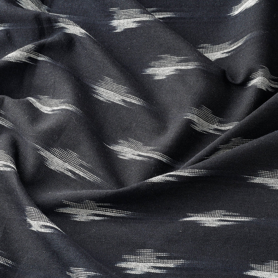 Fine quality black with butta pochampally ikat weave cotton fabric from Koyyalagudem Village in Andhra Pradesh. Ikat (Ikkat) is a dyeing technique used to pattern textiles that employs a resist dyeing process similar to tie-dye on either the warp or weft fibers prior to dyeing. Ikat has lovely patterns and are world famous for their extremely beautiful colors, texture and designs. Indian Ikat is always admired by the fashion designers around the world.