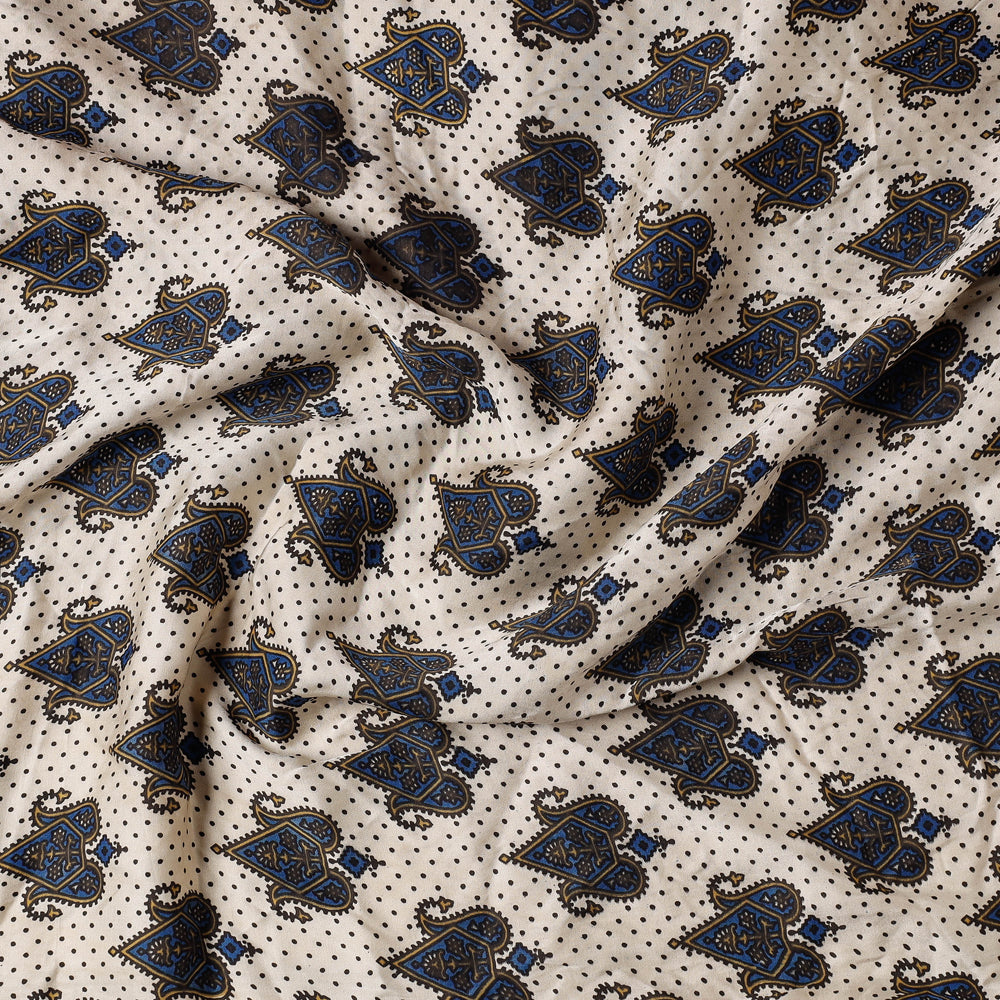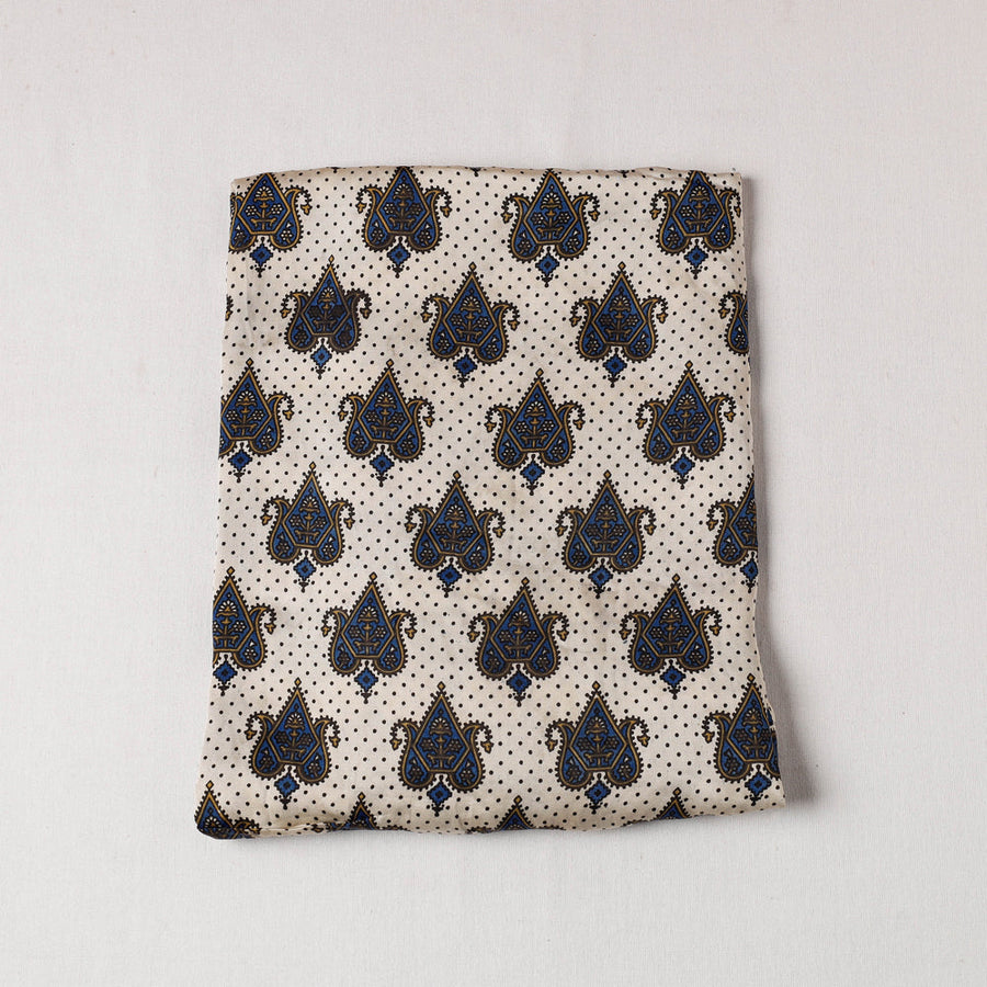 Fine quality white ajrakh block printed modal silk precut fabric made using natural dyed through traditional process of hand block printing practised by the artisans in Kutch region of Gujarat. Modal silk is a soft, shiny and highly lustrous fabric, achieved through interlacing modal fibers and silk yarns. it has opulence of silk and the comfort of cotton modal is a fine and soft textured weave.