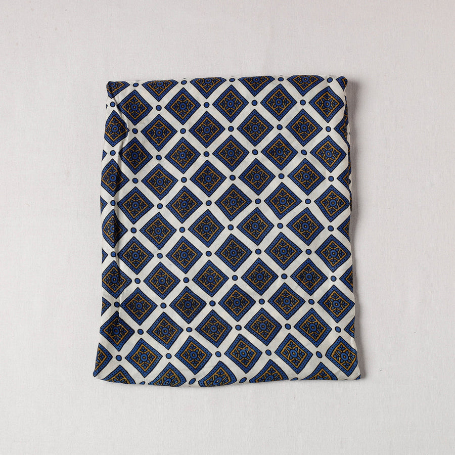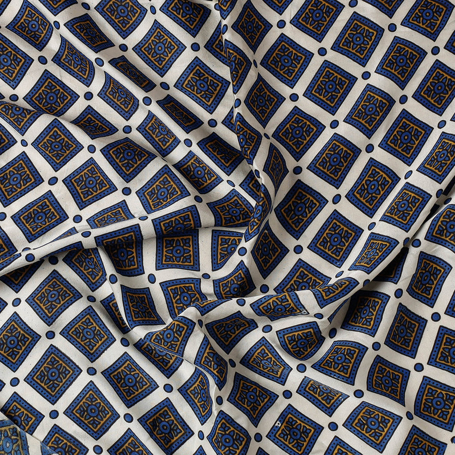 | Material | Fine quality blue ajrakh block printed modal silk precut fabric made using natural dyed through traditional process of hand block printing practised by the artisans in Kutch region of Gujarat. Modal silk is a soft, shiny and highly lustrous fabric, achieved through interlacing modal fibers and silk yarns. it has opulence of silk and the comfort of cotton modal is a fine and soft textured weave. |