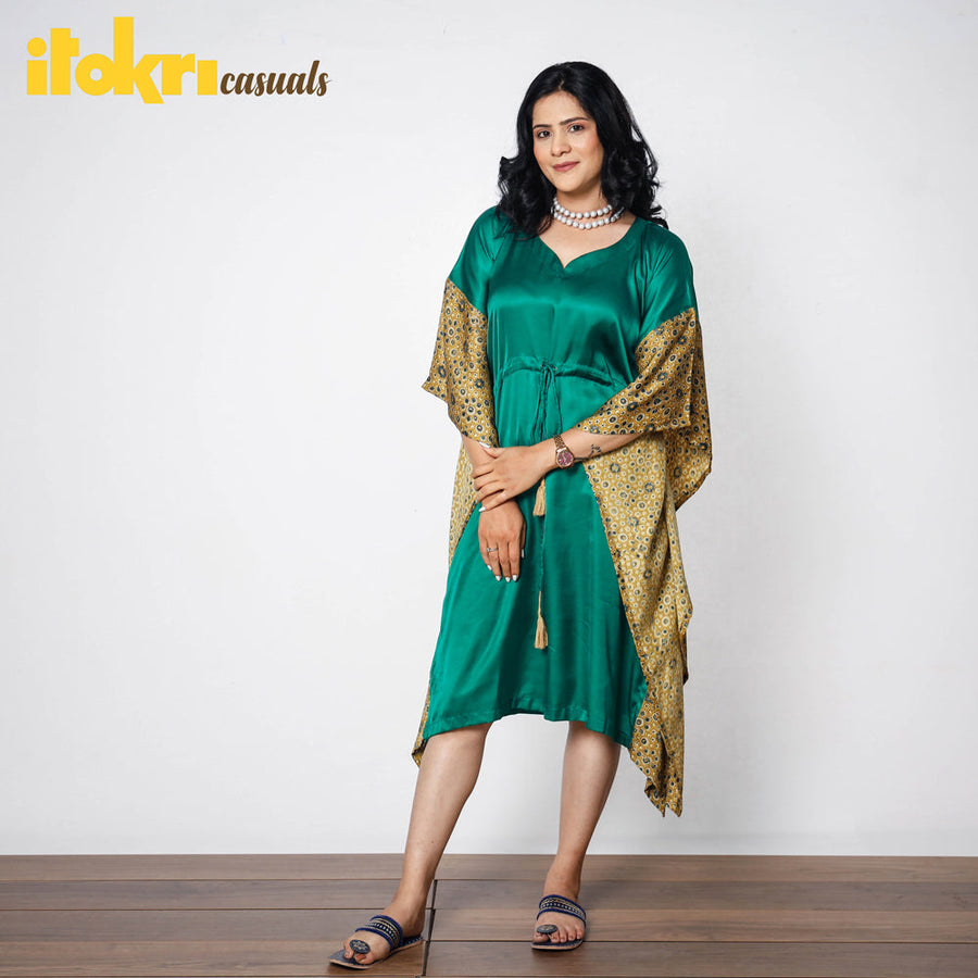 Fine quality green modal silk ajrakh block printed knee length kaftan dress with tie-up waist. A traditional kaftan or caftan is an knee-length garment with long, flowing sleeves. It has an adjustable drawstring waist. These loose-fitting cotton kaftans are enhanced by a soft touch and beautiful tie-dye patterns. This dress will allow you to move with ease and comfort. The drawstring waist tie will give you the freedom to customize the fit to suit your unique shape.