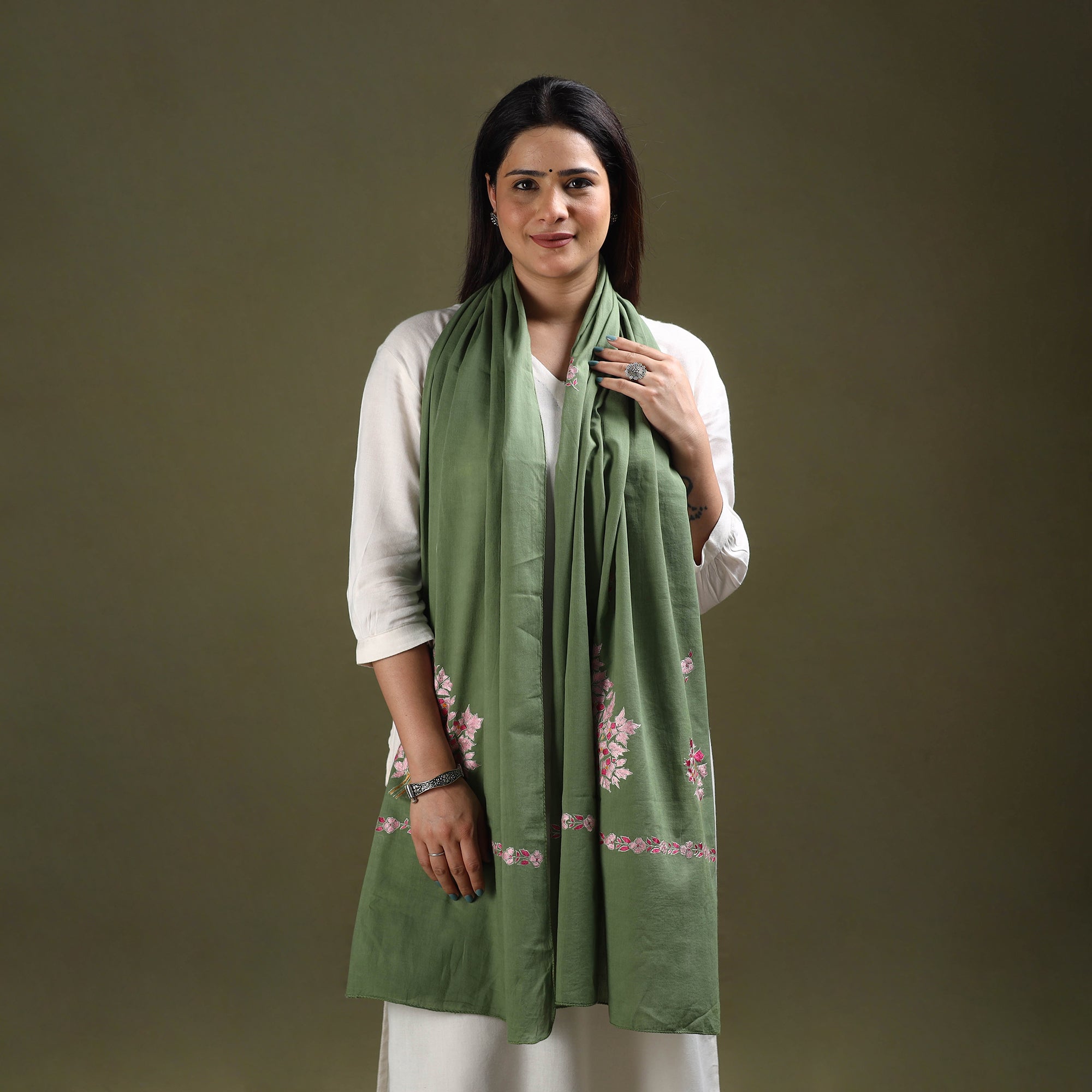 Add elegance to your outfits with this lightweight green cotton kashida embroidery stole  featuring intricate kashida embroidery crafted with multicolored threads. Inspired by nature it blends timeless design with everyday practicality. Perfect for casual or formal wear its breathable, sustainable, and easy to style.