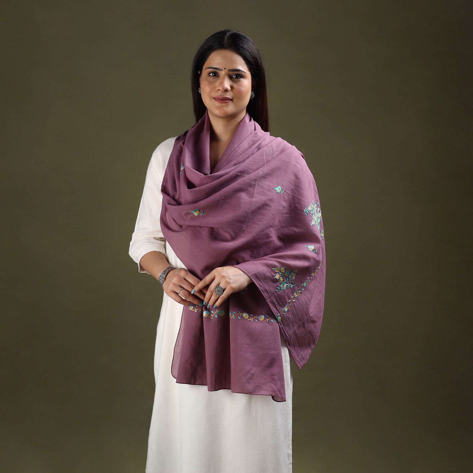 Add elegance to your outfits with this lightweight purple cotton kashida embroidery stole  featuring intricate kashida embroidery crafted with multicolored threads. Inspired by nature it blends timeless design with everyday practicality. Perfect for casual or formal wear its breathable, sustainable, and easy to style.