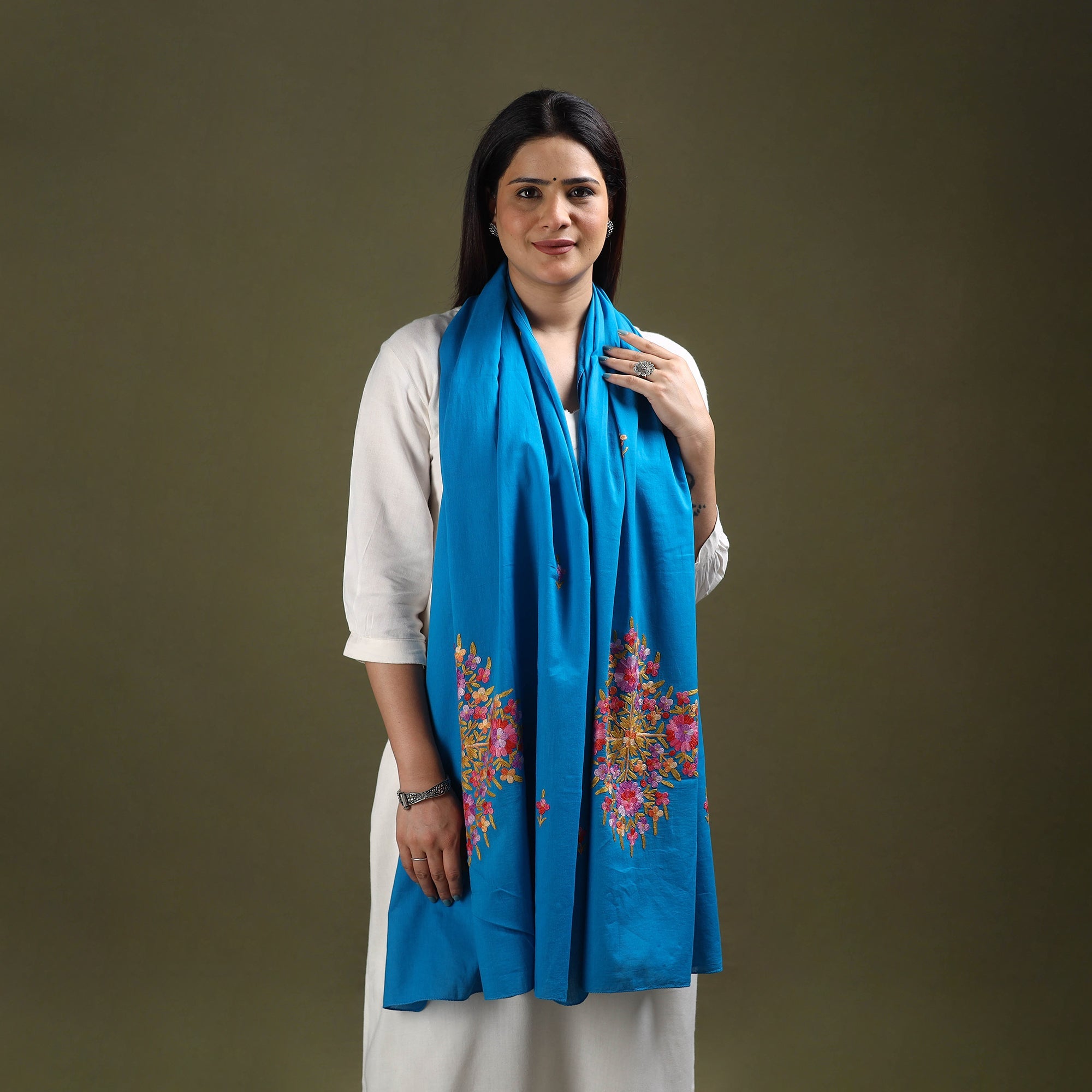 Add elegance to your outfits with this lightweight blue cotton kashida embroidery stole  featuring intricate kashida embroidery crafted with multicolored threads. Inspired by nature it blends timeless design with everyday practicality. Perfect for casual or formal wear its breathable, sustainable, and easy to style.