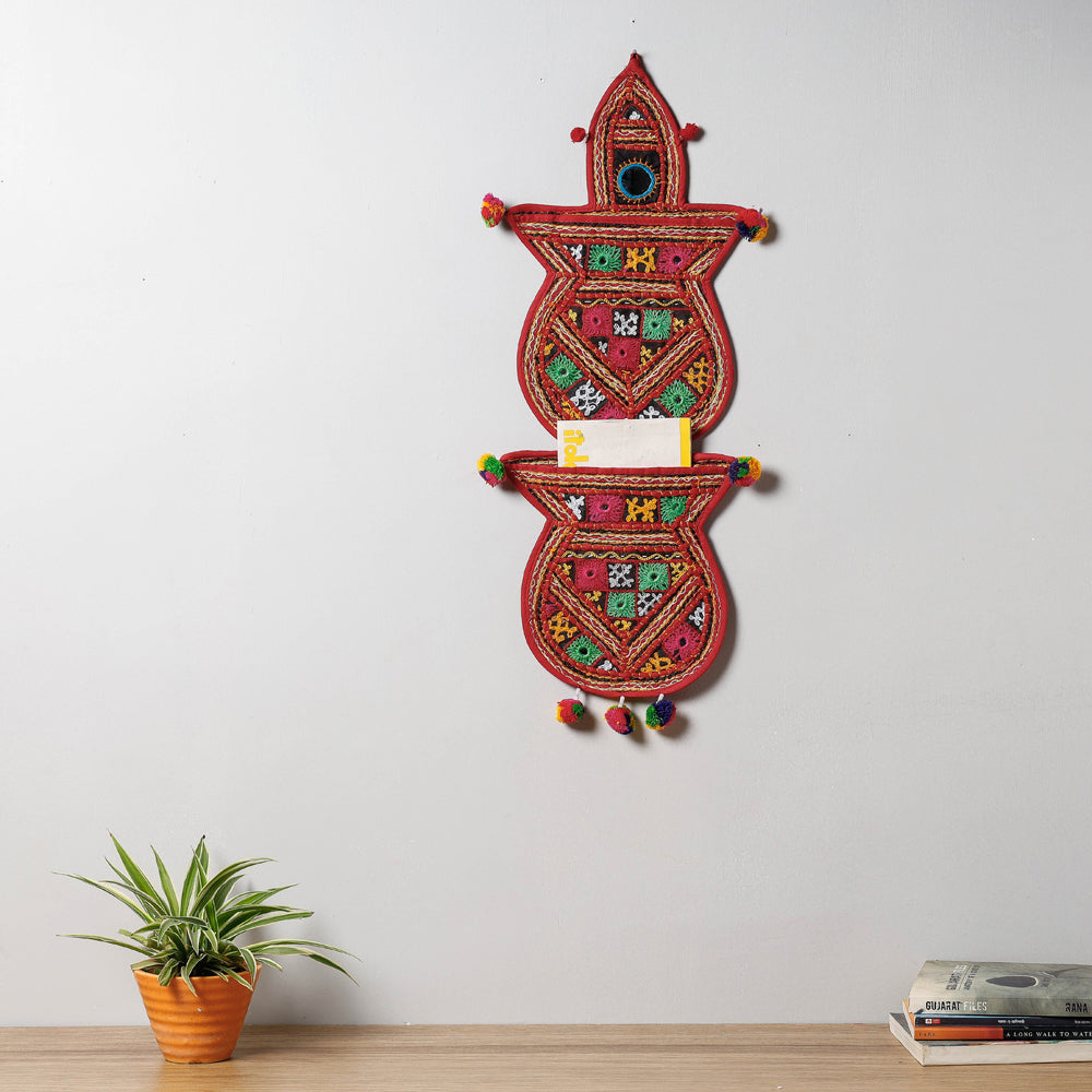 Handcrafted mirror work kutch hand embroidered kalash cotton wall hanging letter holder. The Kutch Embroidery is a handicraft and textile signature art tradition of the tribal community of kutch district in Gujarat. This embroidery with its rich designs has made a notable contribution to the Indian embroidery traditions. The embroidery, practiced normally by women is generally done on fabrics of cotton, in the form of a net using cotton or silk thread.