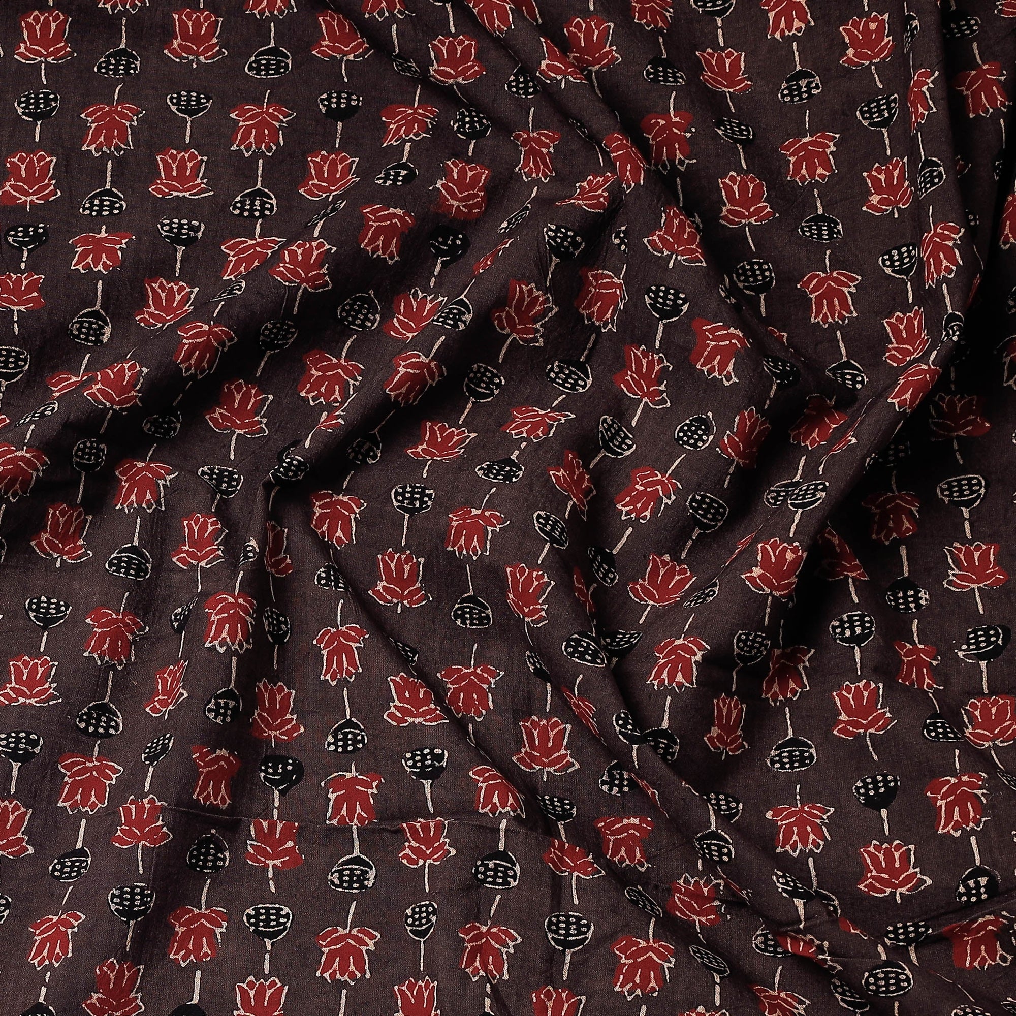 Fine quality brown ajrakh block printed cotton fabricmade using natural dyes through traditional ajrakh technique of hand block printing by Sufiyan Khatri practised in Kutch region of Gujarat. Ajrakh is a traditional vegetable dyeing and resist block-printing technique on cloth. It is estimated to be around 4,500 years old. The Ajrakh artisans in India are originally from Sindh and they migrated to Kutch in Gujarat and Barmer in Rajasthan. Ajrakh is the traditional attire of the Maldhari pastoral community of Bhuj. The process of 'Ajrakh' is a long drawn process with many stages and each layer of colour is printed after a gap of time so the cloth has to stay for the day.