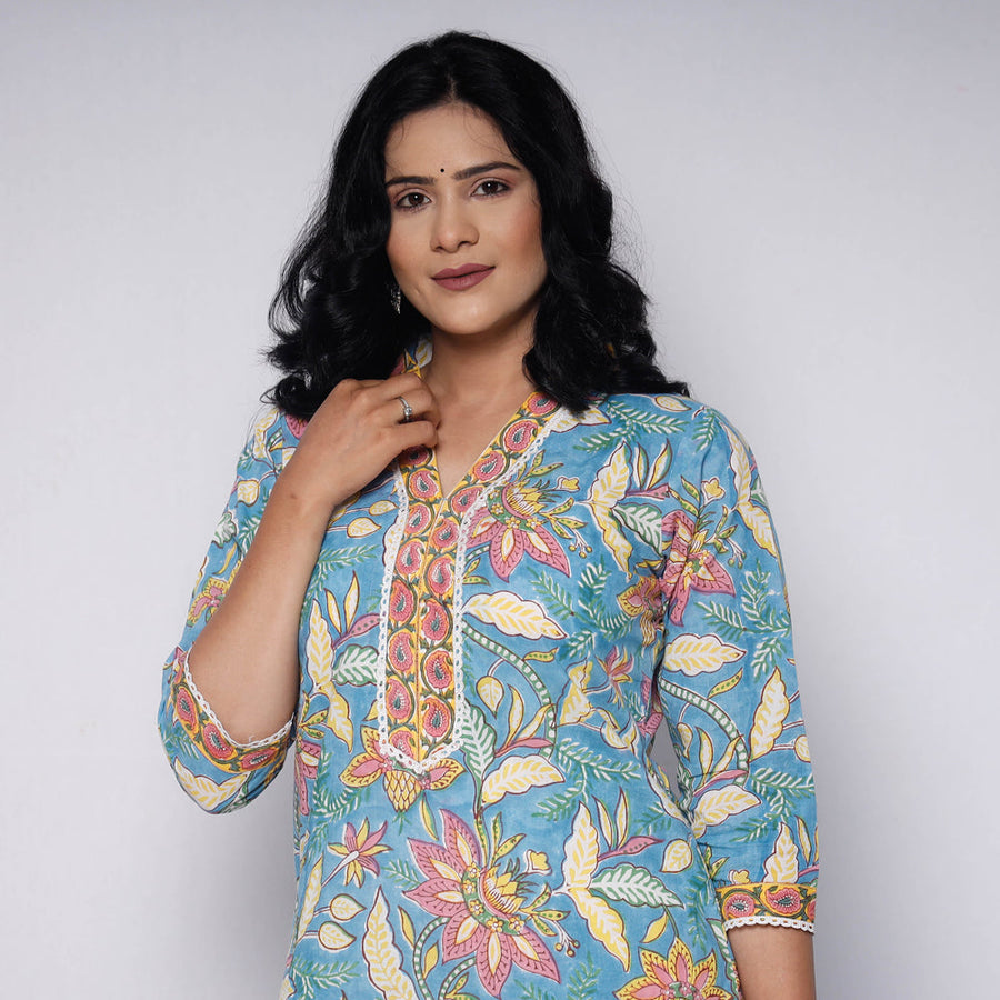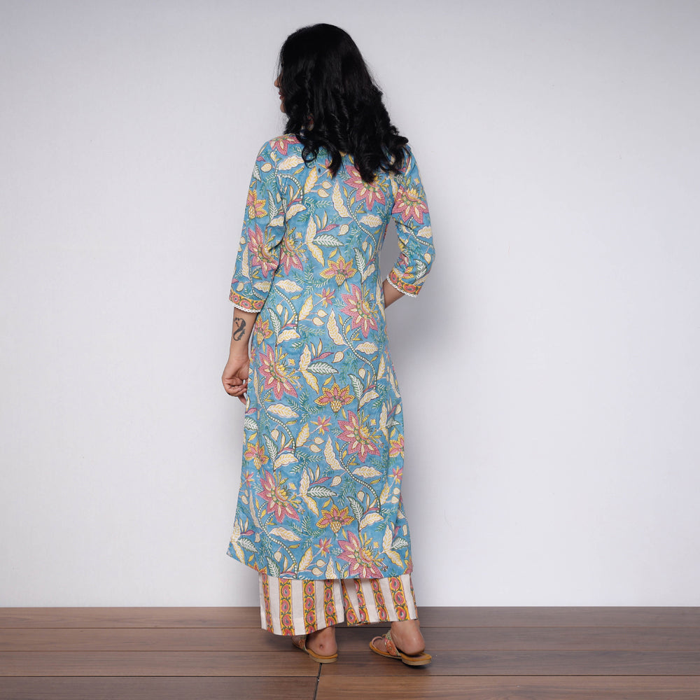 Fine quality sanganeri hand block printed cotton long kurta with palazzo and side pocket. Look and feel beautiful in this uniquely designed cotton long kurta. This cotton kurta makes you comfortable with ease all day long. This kurta is perfect for your daily outing and for a special occasion.