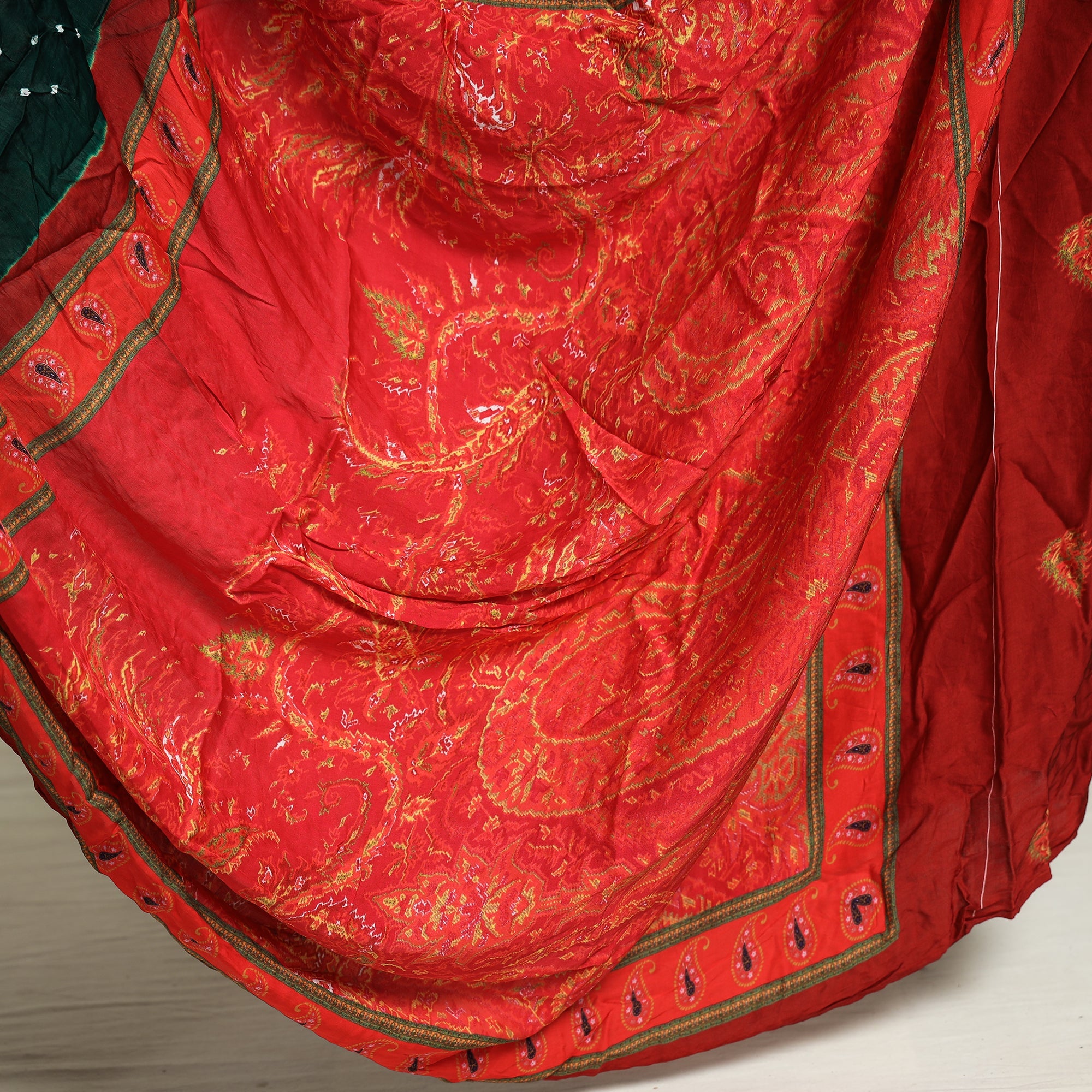 Fine quality green kutch bandhani modal silk pichwai printing saree featuring majestic bandhani pattern, tie-dyed using the traditional technique practised by the artisans of Kutch. The art of Bandhani (Bandhej) is highly skilled process. The technique involves dyeing a fabric which is tied tightly with a thread at several points. Modal silk is a soft, shiny and highly lustrous fabric, achieved through interlacing modal fibers and silk yarns. it has opulence of silk and the comfort of cotton modal is a fine and soft textured weave.