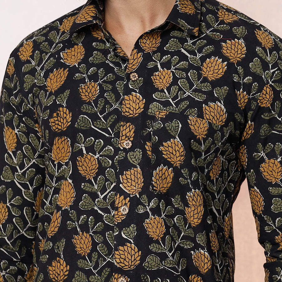 Fine quality kalamkari hand block printednatural dyed pure cotton full sleeve shirt with regular collar for men. Kalamkari is the earliest and more complex techniques of block-printing. This flourished at Machilipatnam, Andhra Pradesh. Showcasing an assortment of hand block printed motifs inspired by traditional kalamkari painting.