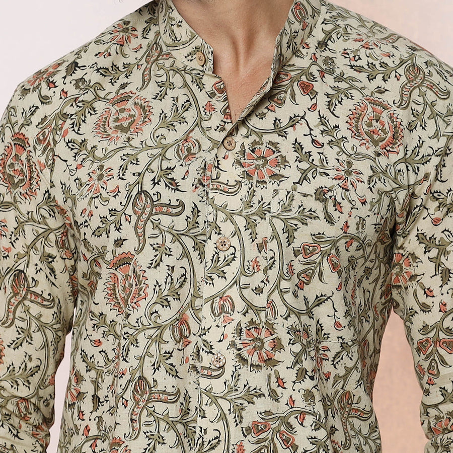 Fine quality kalamkari hand block printednatural dyed pure cotton full sleeve shirt with regular collar for men. Kalamkari is the earliest and more complex techniques of block-printing. This flourished at Machilipatnam, Andhra Pradesh. Showcasing an assortment of hand block printed motifs inspired by traditional kalamkari painting.