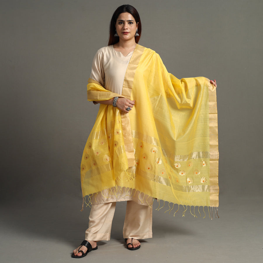 Fine quality traditional chanderi silk handloom zari buta dupatta with intricate zari weaving. Chanderi silks are known for its gossamer looks and amazing feel. Chanderi weaving is practiced in the historic town of Chanderi in Madhya Pradesh. The buttis or motifs on chanderi blend are primarily hand woven on handloom, with the use of needles. Separate needles are used to create different motifs.