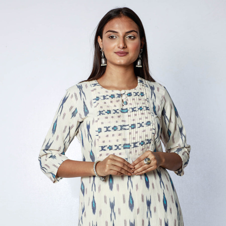 Look and feel beautiful in this uniquely designed pochampally ikat weave cotton long kurta with side pocket. This cotton kurta makes you comfortable with ease all day long. Ikat has lovely patterns in extremely beautiful colours. Ikat fabrics are world famous for their colours, texture and designs. Indian Ikat is one of the fabrics that is always admired by the fashion designers around the world.