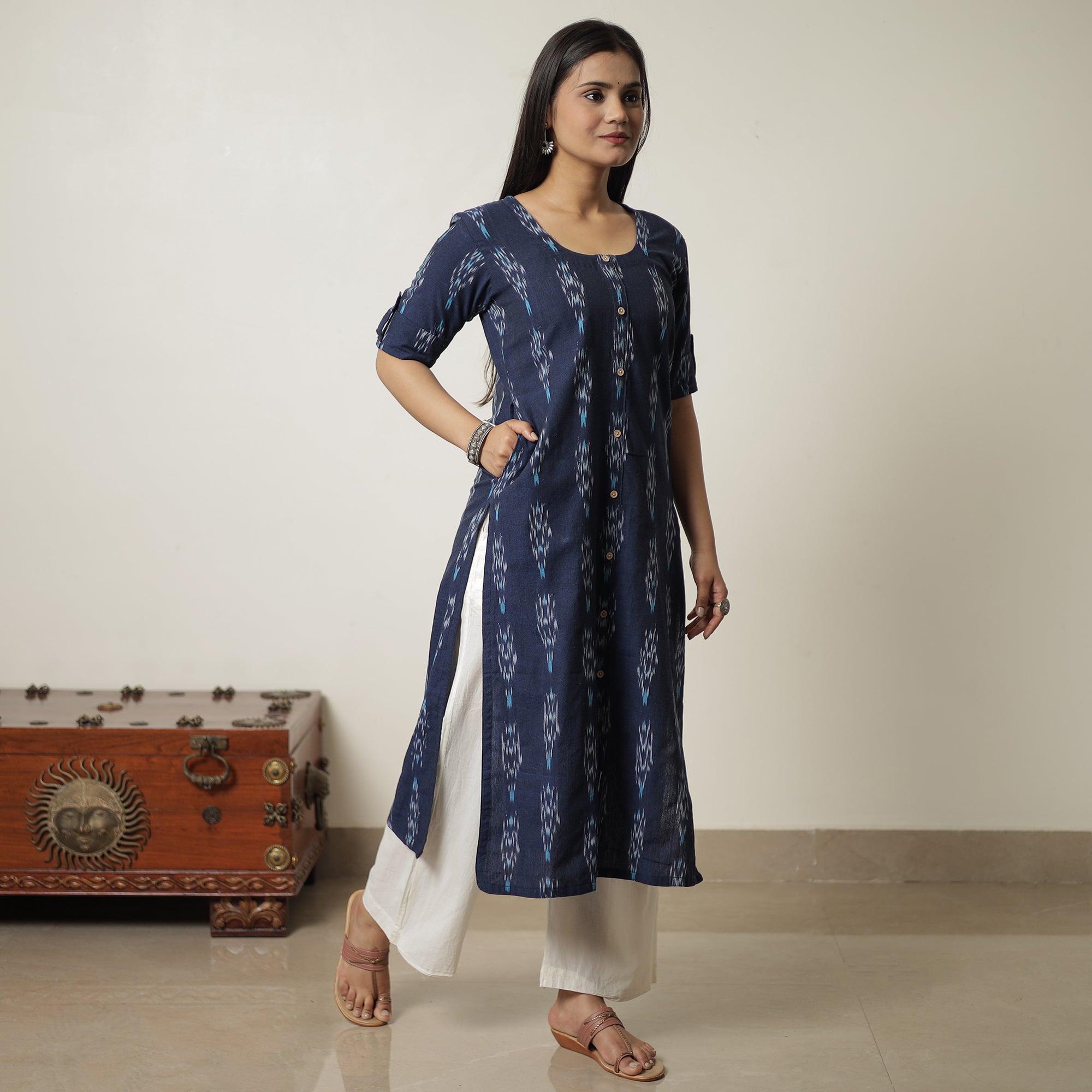 Look and feel beautiful in this uniquely designed pochampally ikat weave cotton long kurta with side pocket. This cotton kurta makes you comfortable with ease all day long. Ikat has lovely patterns in extremely beautiful colours. Ikat fabrics are world famous for their colours, texture and designs. Indian Ikat is one of the fabrics that is always admired by the fashion designers around the world.