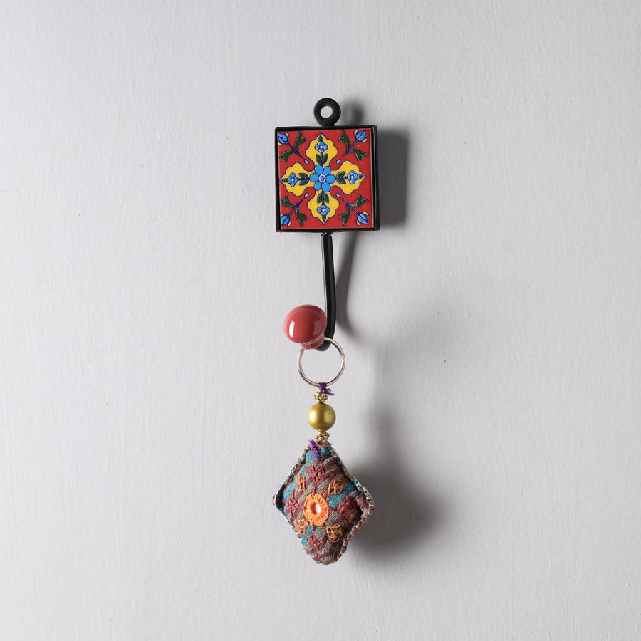 This finely done red wall hanger is crafted from blue pottery ceramic tile & iron rod. It has 1 peg for hanging keys, coat, towel or any clothing, has one wall mount hook on the back for easy hanging. Blue Pottery is widely recognized as a traditional craft of Jaipur, though it is Turko-Persian in origin. The name 'blue pottery' comes from the eye-catching blue dye used to color the pottery. Jaipur blue pottery, made out of a similar frit material to Egyptian faience, is glazed and low-fired. No clay is used: the 'dough' for the pottery is prepared by mixing quartz stone powder, powdered glass, Multani Mitti (Fuller's Earth), borax, gum and water. It is the only pottery in the world that does not use clay.